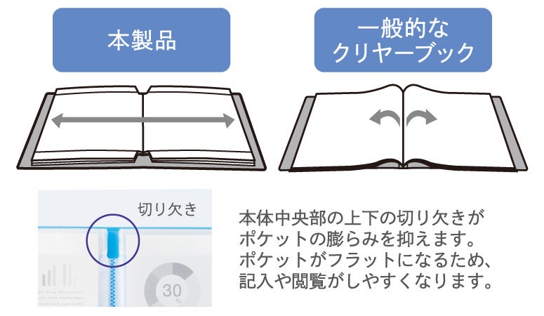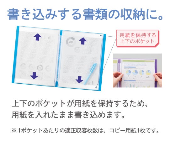 上下のポケットで用紙を保持する『書き込めるクリヤーブック』です。書類を出し入れせず、ポケットに挿入したまま書き込むことができます。ポケット中央部の上下の切り欠きが書類を入れた際の膨らみを抑え、ポケットがフラットに開くため、記入や閲覧がしやすい仕様です。打ち合わせや授業で使用する資料やプリントなど、