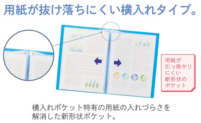 新形状のポケットで用紙の入れにくさを解消した横入れタイプのクリヤーブックです。ポケットの開口部を広げることで、用紙が斜めになっても引っ掛かりにくい仕様です。ポケット上部には等間隔にふせんを貼れる目印付きです。横入れタイプのため収納した用紙が抜け落ちづらく、持ち運びにぴったりです。