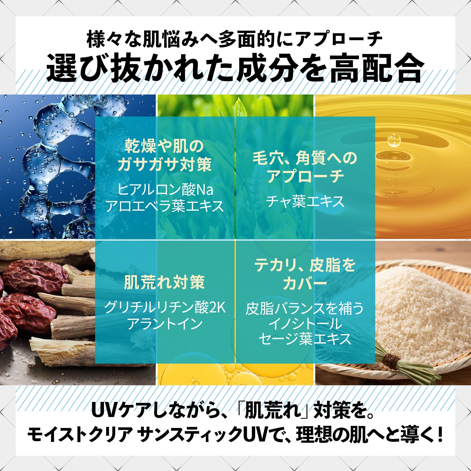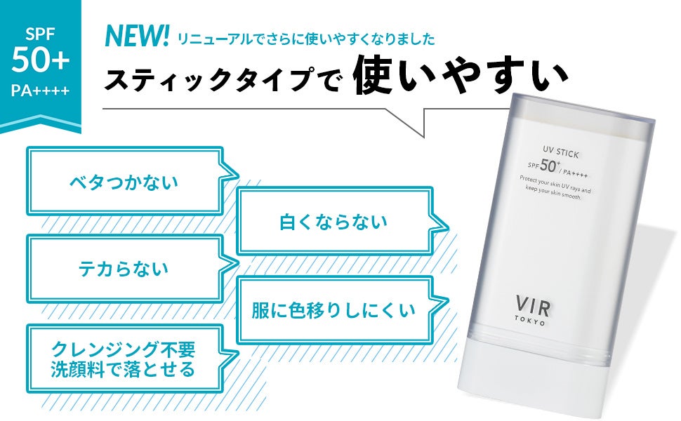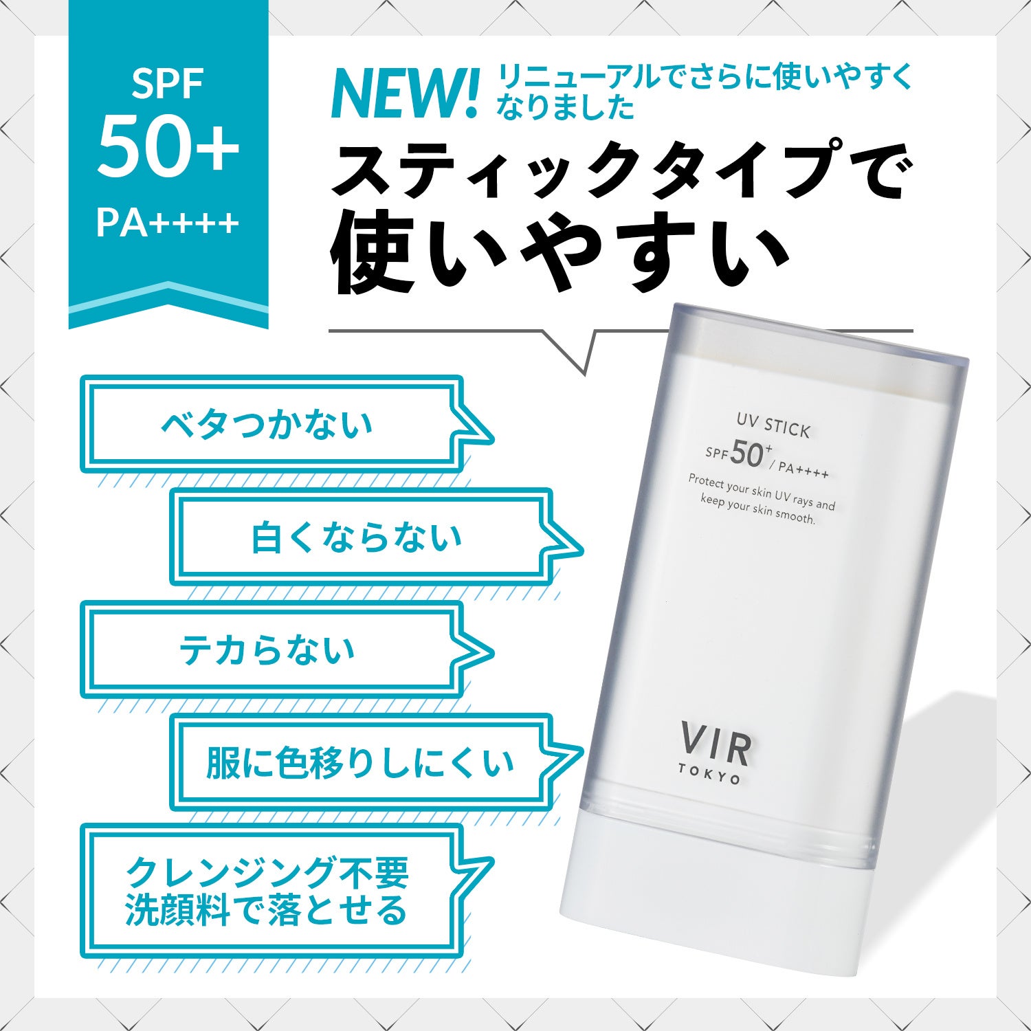 VIR TOKYO UV STICK MOIST CLEARはベタつかない、テカらない、クレンジング不要で洗顔料で落とせる、白くならない、服に色移りしにくいものにリニューアルしました。