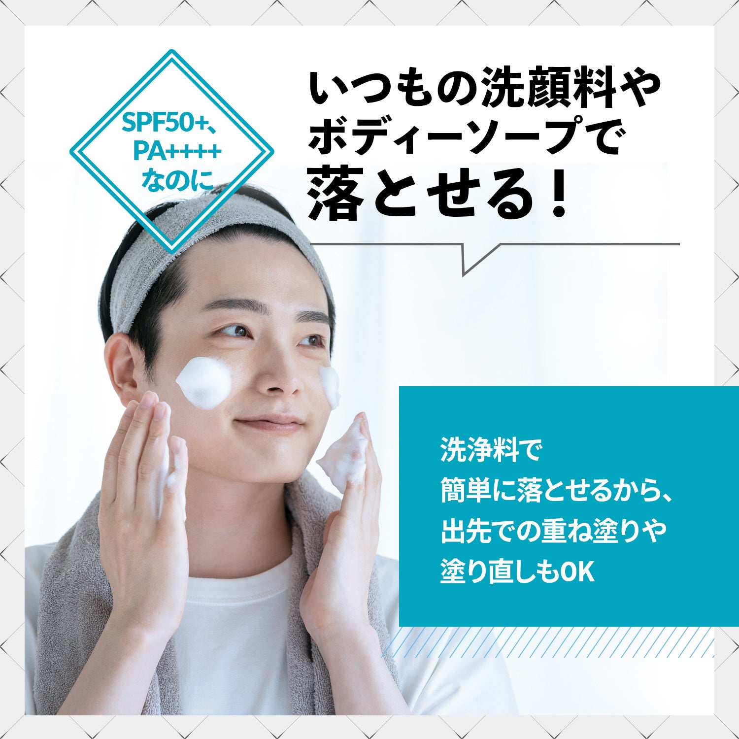 SPF50+、PA++++なのに、いつもの洗顔料やボディソープで落としていただけます。