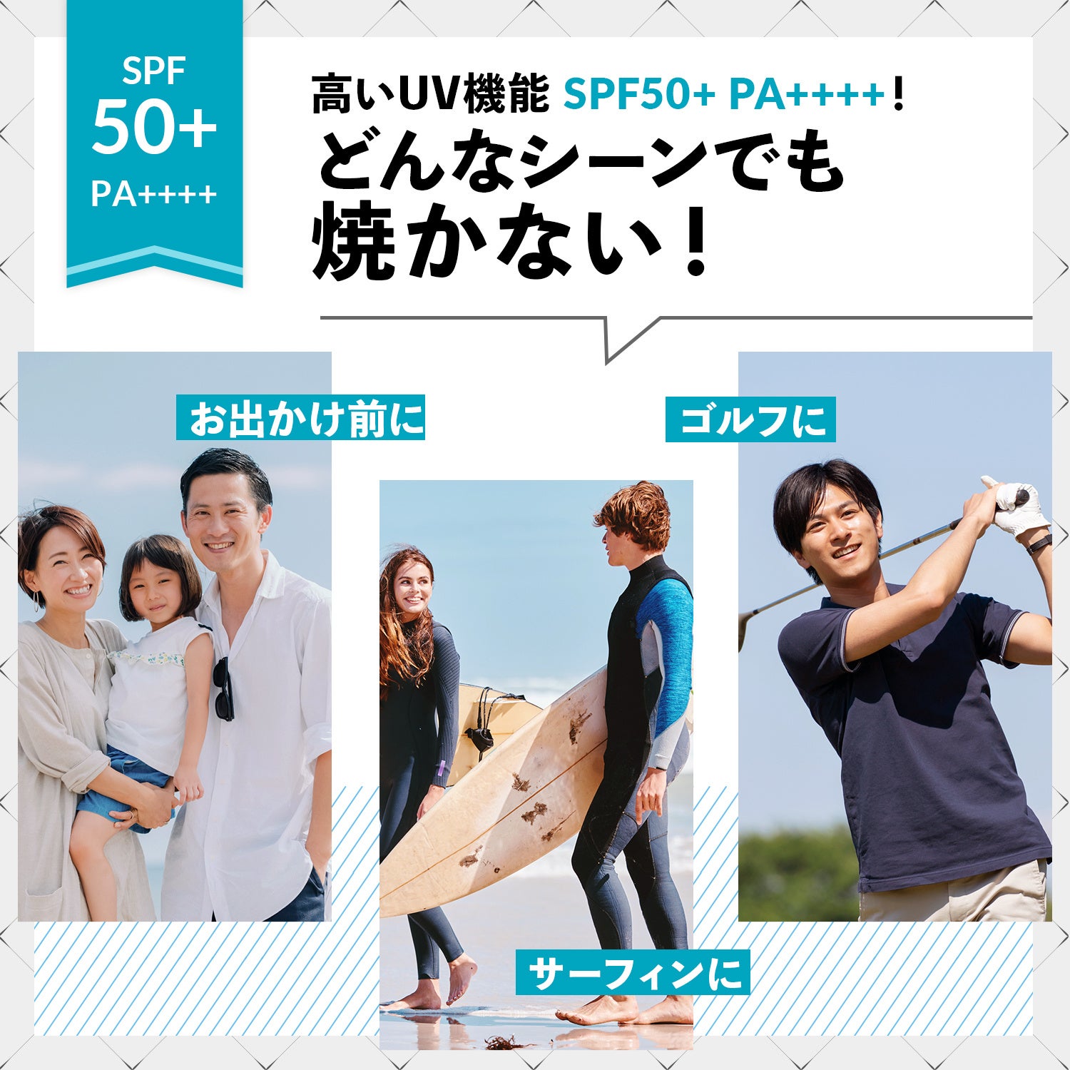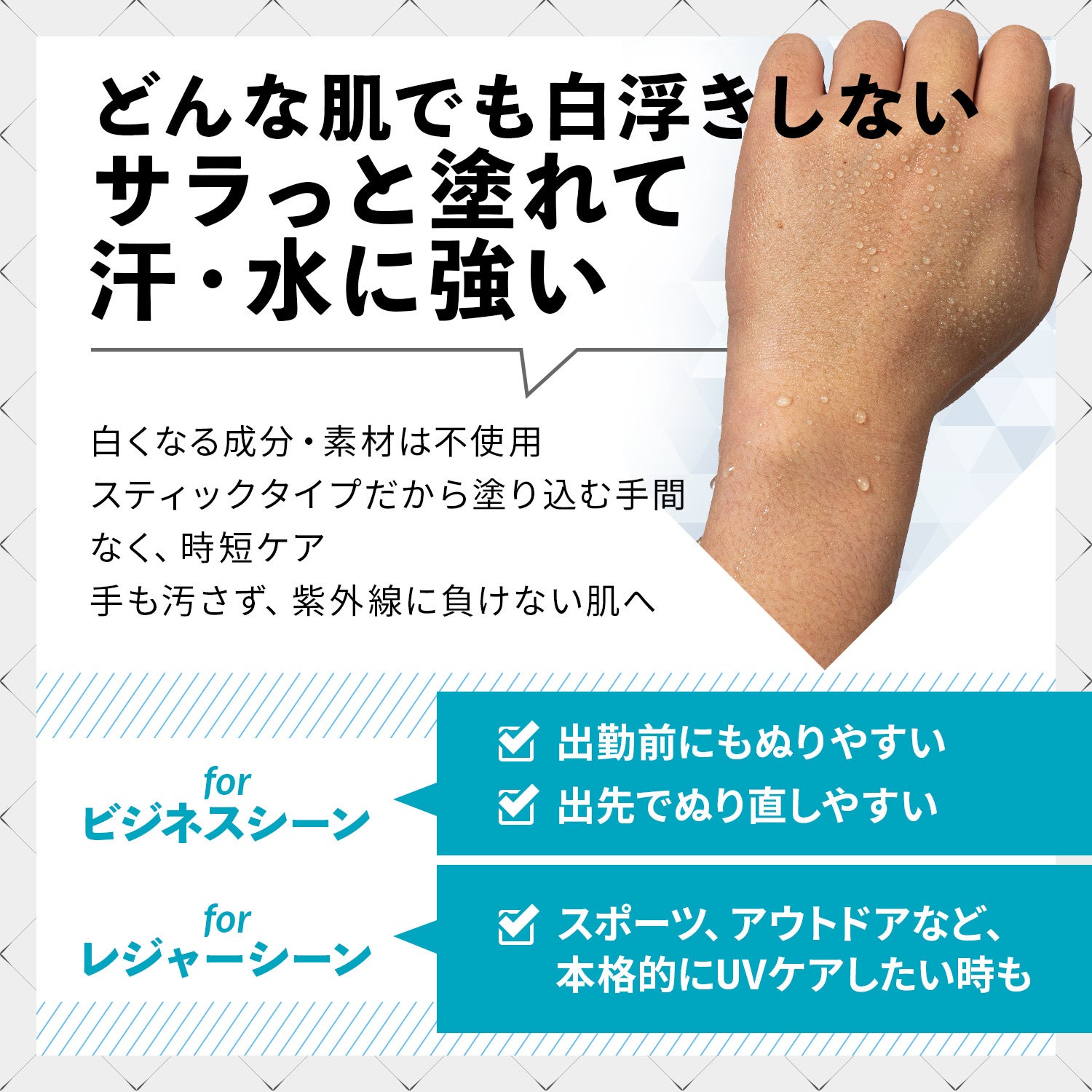 白浮きせず、サラっと塗れて汗・水に強い処方だからビジネスシーン・レジャーシーンどちらでも大活躍します。