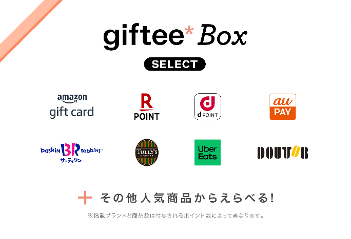 3.giftee Box select内のポイント交換レートは商品により異なります。記載された必要ポイント数をよくご確認の上、商品と交換ください。