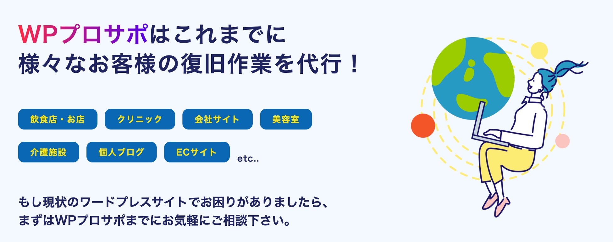 WordPressサイトのハッキング被害や、表示エラーが急増中!WPプロサポはお客様のWEBサイトの不具合を最短60分以内に解決致します。ワードプレス復旧ならWPプロサポにお任せ下さい。