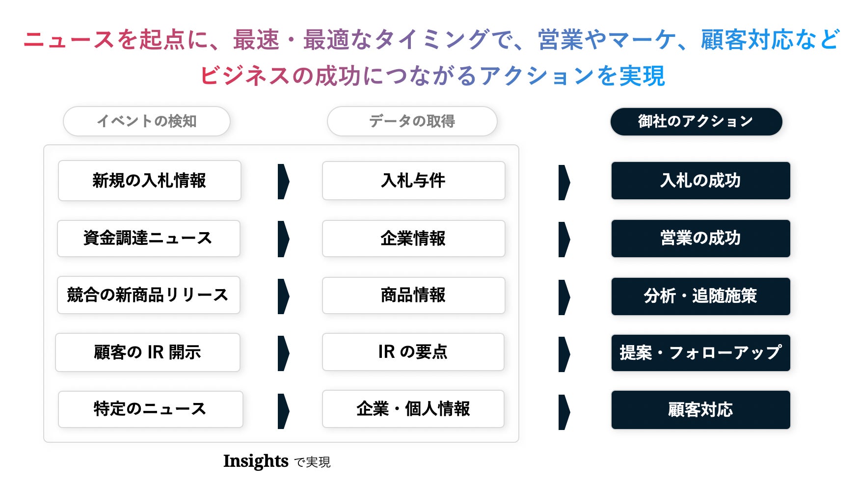 たとえば、資金調達や人材募集の情報から企業情報だけを抜き出して、営業リストのように活用したり、競合の商品情報を定期的に収集して、自社の研究開発に活用することも可能です。行政の通知通達や、指定したウェブサイトの細かい更新情報も取得出来ます。