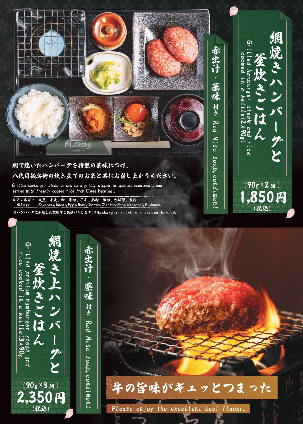 自分で焼き上げる楽しさと香ばしい香りを満喫できる新商品、「網焼きハンバーグと釜炊きごはん」。網で焼いたハンバーグを特製の薬味につけ、八代目儀兵衛の炊き立てのお米と共にお召し上がりください。