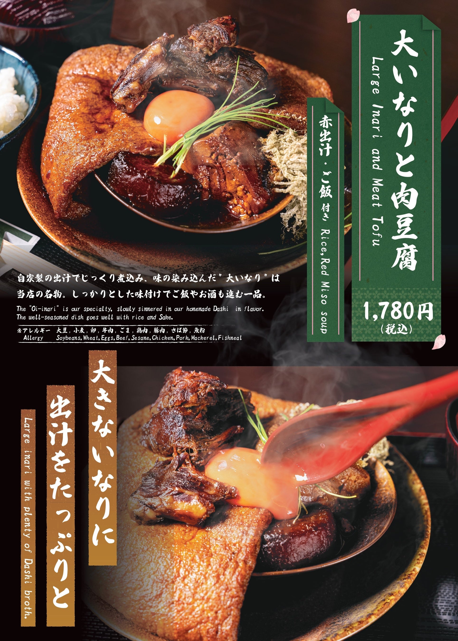 自家製の出汁でじっくり煮込み、味の染み込んだ"大いなり"は当店の名物。しっかりとした味付けでご飯やお酒も進む一品。