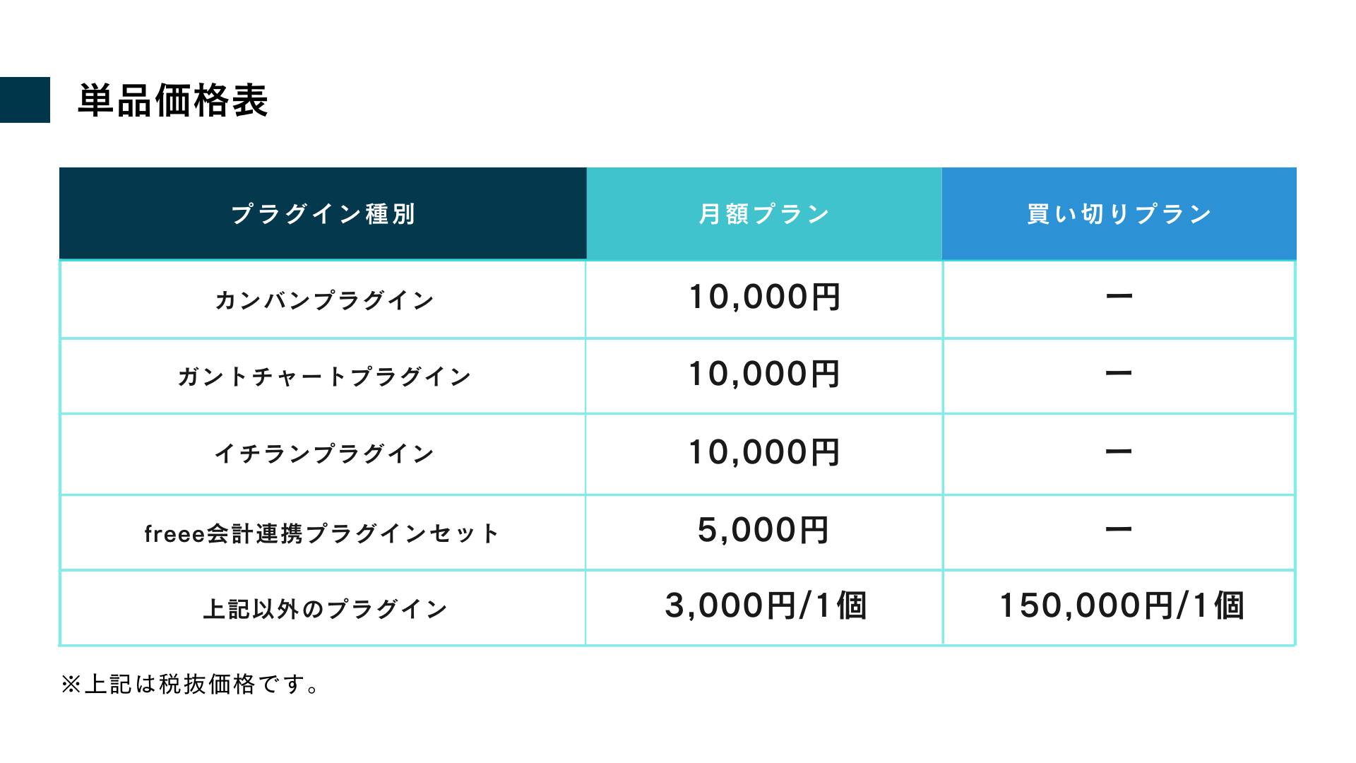 カンバン、ガントチャートなどの一部プラグインはセット販売しておりません。ご購入の際はセットに含まれるプラグインをご確認くださいませ。