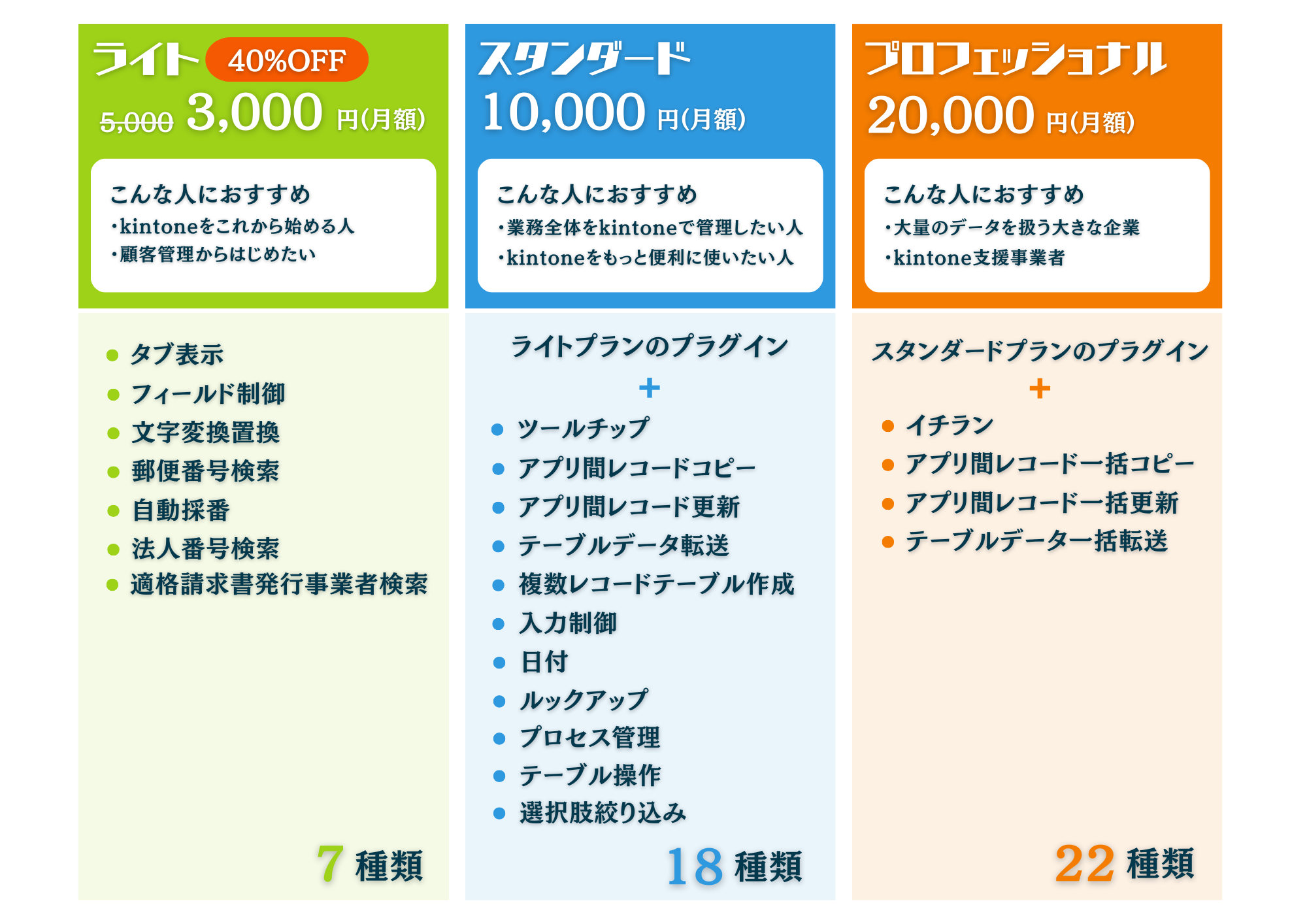 当社が提供するkintoneプラグインセットは、ライトプラン、スタンダードプラン、プロフェッショナルプランの3つのプランで展開されています。