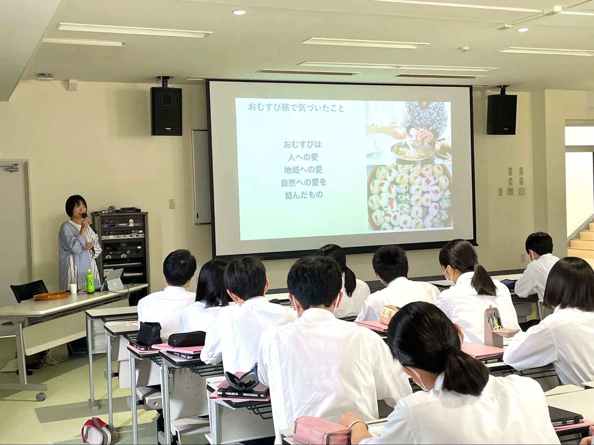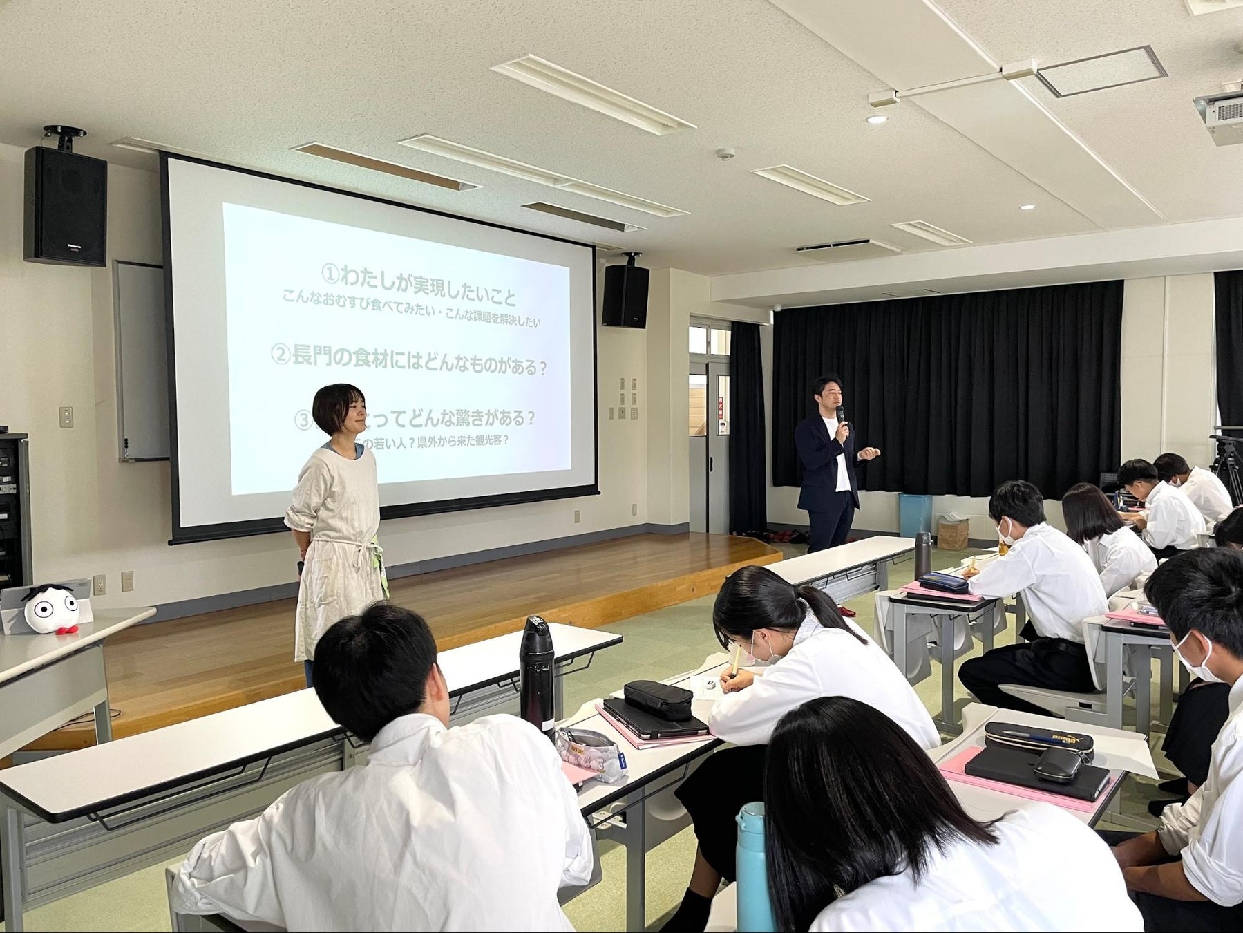 1学期はプロデューサーになるためのインプット探究とし、「おむすび」の魅力と可能性を学ぶため、旅するおむすび屋代表 菅本香菜氏による2日間にわたるワークショップを開催しました。6月7日(1日目)は、おむすびに出会ったきっかけやおむすびを仕事にされている理由、さらに「好き」や「探究」を仕事にできることを学びました。6月8日(2日目)は、菅本氏と田口弦矢(株式会社HafH Co-Living Operations代表取締役)から商品開発のときのヒントや、コミュニケーションのコツを学びました。その後、菅本氏がむすんだ「長門市の素材を使ったおむすび」を試食し、地域の魅力を五感で体験しました。