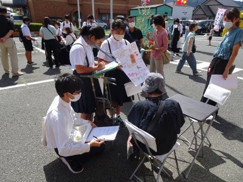 「長門市中央公民館まつり」の開催にあわせて、大津校舎1年生、長門市中央公民館で深川小学校5年生・明倫小学校6年生で開発中のおむすびがお客様に支持される商品開発となるよう街頭調査を行いました。小学生のおむすび案を元に、「塩むすび」「焼き鳥むすび タレ味」「焼き鳥むすび マヨ味」の三種類を用意し、商品ターゲットを想定しながら小学生と高校生が協力して声をかけ、試食・アンケート調査を実施しました。