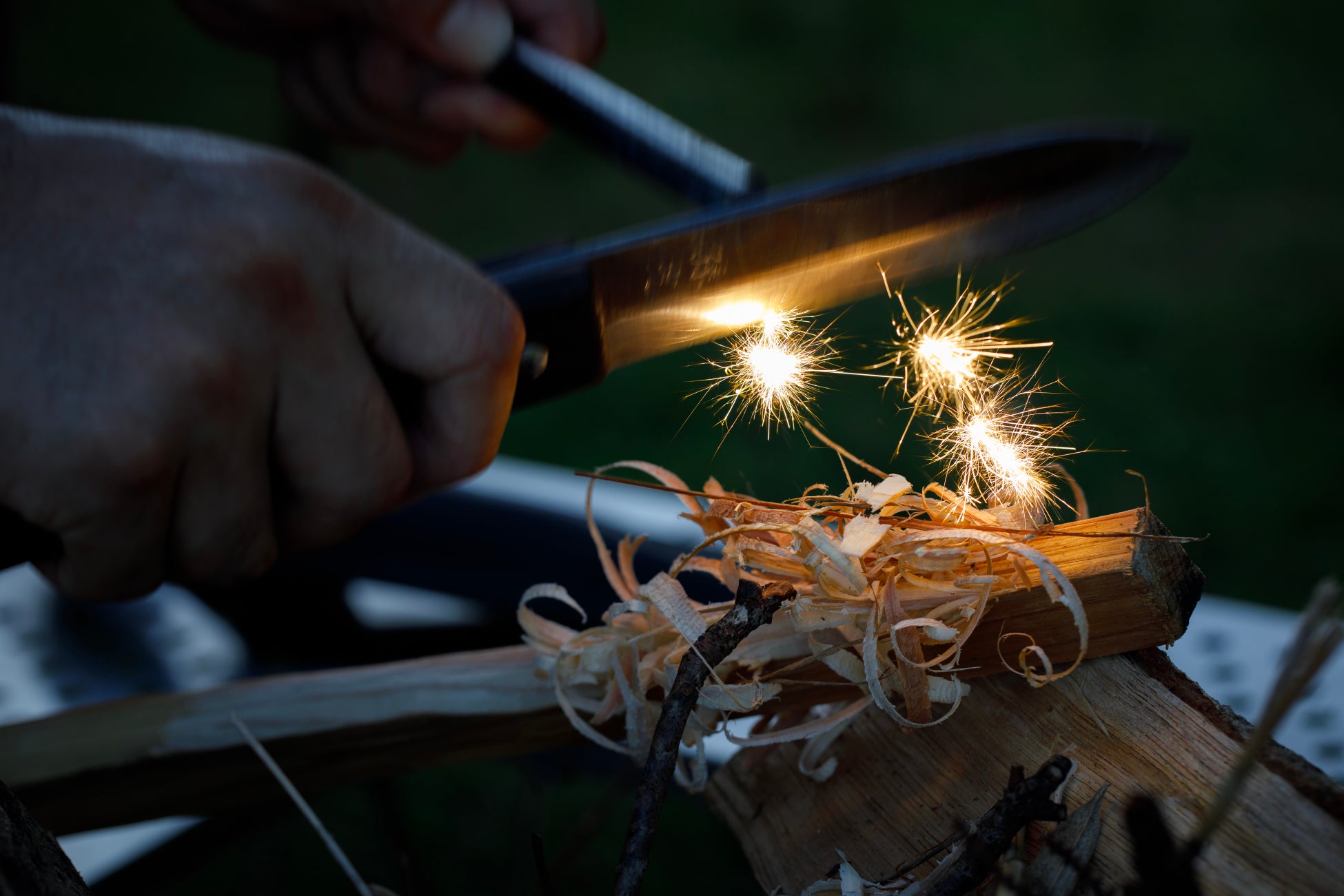 TAFUは、漁師が網を切ったり魚をさばいたりする万能包丁「マキリ」の技術を転用しました。硬くて丈夫な鋼(はがね)を、さびにくいステンレスで挟んで仕上げた自慢の一品で、肉や野菜を切るのも、まき割りも簡単です。マグネシウム棒を打つと着火できることもポイントです。