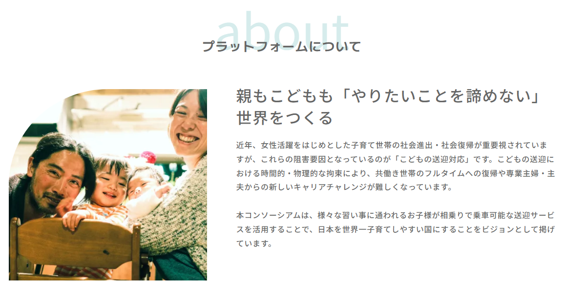 「誰もが諦めない世界を」をビジョンに、地域の習い事に通うお子様が相乗りして目的地へ行けるスクールシャトルシェアリングに関する各種サービスを提供しており、輸送事業者のみに留まらない様々な関係者と連携した事業展開を行っています。