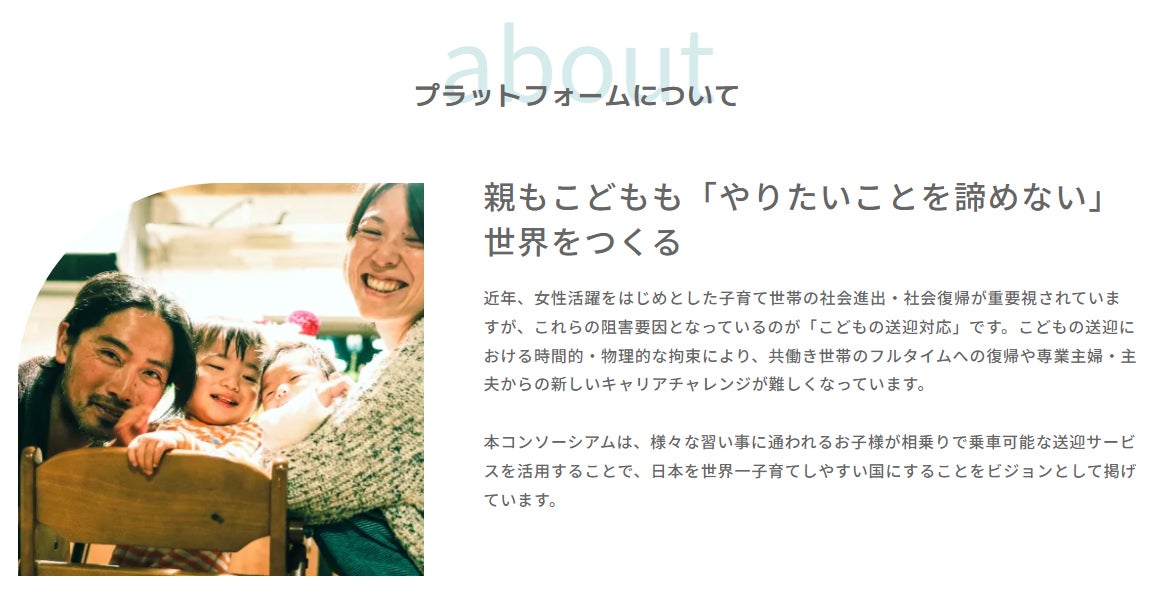 地域が一体となった安心・安全な移動環境を整備するために、教育、医療、タクシー、システム開発、金融機関、保険、自動車販売、地方自治体、各種業界団体等のこどもの移動に関わる多様なメンバーでコンソーシアムの運営を行っており、こどもの送迎課題をはじめ、様々な課題可決への取り組みを可能としています。