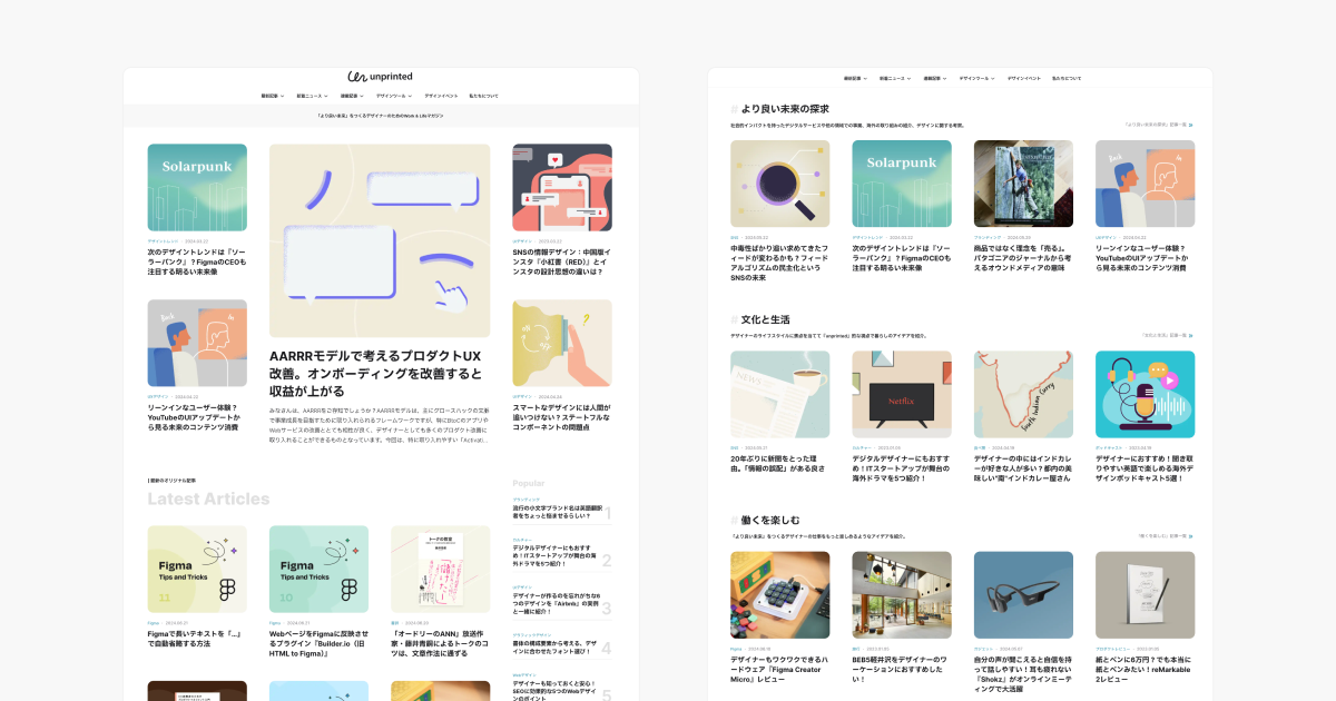 新たに策定したブランドステートメントと、4つのメイントピックに合わせてメディアサイトのホーム画面レイアウトもリニューアル。これまでと比べ、より多角的な視点からunprintedのオリジナル記事と出会えるような画面構成に生まれ変わりました。