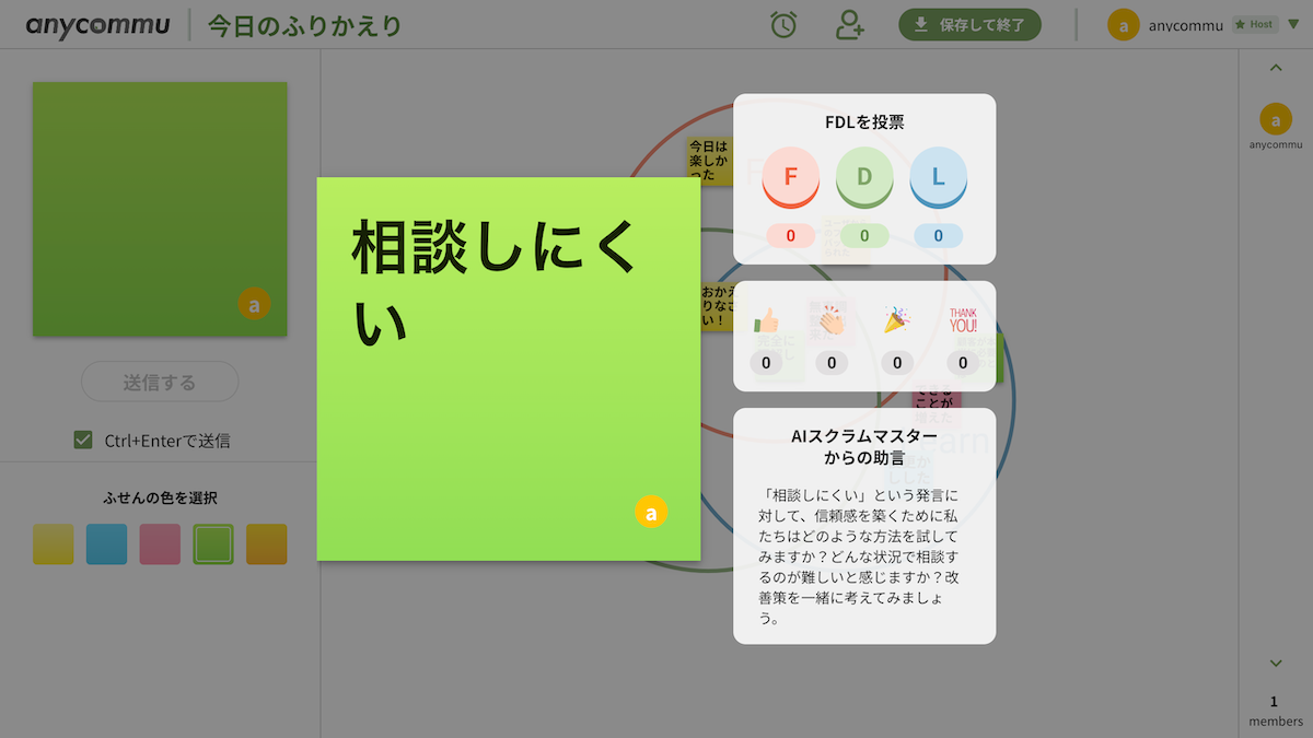 今回はanycommuに、スクラムの進行役となる「AIスクラムマスター」機能を実装しました。この機能は、チーム内のコミュニケーションと、思考の深化を促進させることを目指しています。 AIスクラムマスターは、チームメンバーのふりかえり内容に対して、生成AIが独自のフィードバックや問いかけをすることにより、新たな視点からの問いかけが可能となり、深い会話と理解を促します。
