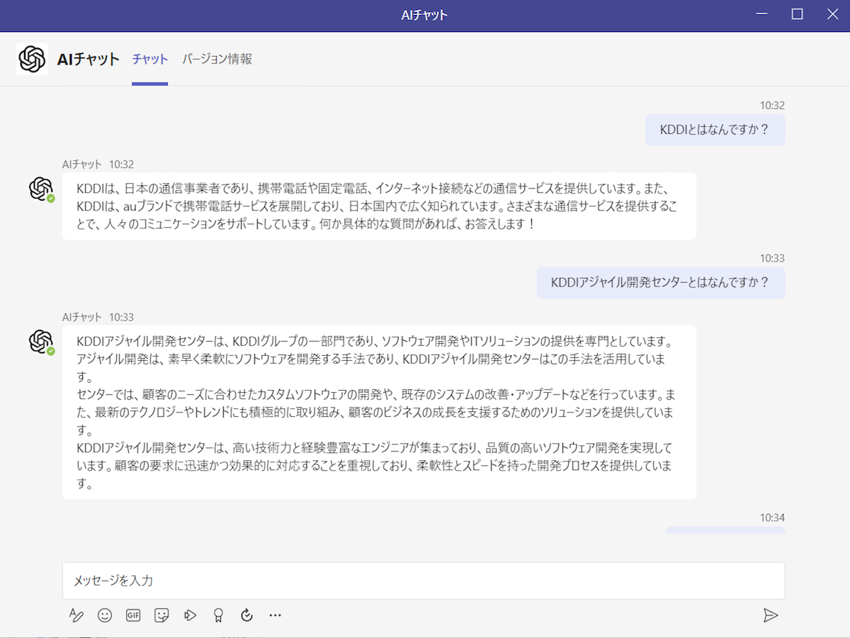 「 KDDI AI-Chat for Teams」は、2023年5月に社員1万人を対象に調査や文章作成支援などを目的として、KDDIが運用開始したwebブラウザ上で利用できる生成AIチャットサービス「KDDI AI-Chat(*2)」を、Microsoft Teamsでも利用できるようにしたものです。