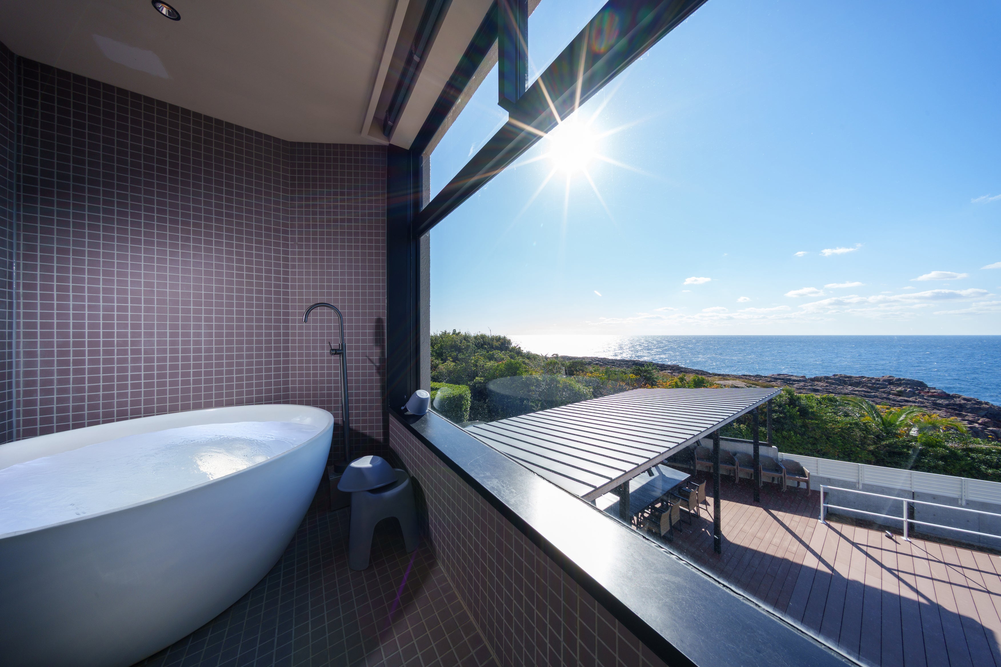 本施設最大の特徴は何といっても客室から望む景色です。果てしなく広がる水平線を眺めていると、海との境界が溶け合い、それらが一体となったような不思議な感覚にお客様を誘います。また太陽が一日の役割を終え、水平線にゆっくりと沈んでいく様子は、何物にも代えがたい瞬間です。自然の雄大さや美しさなど、ぜひお客様自身の感覚で感じ取ってください。設備も充実しており、夏には14m×6mの広さを備えた大型プール、冬にはジャグジーやサウナ、温泉と、季節を選ばずご利用いただけます。温泉は日本三古湯(道後温泉、有馬温泉、白浜温泉)の一つでもある白浜の温泉を源泉かけ流しで採用。皆さまの体を芯からあたためます。