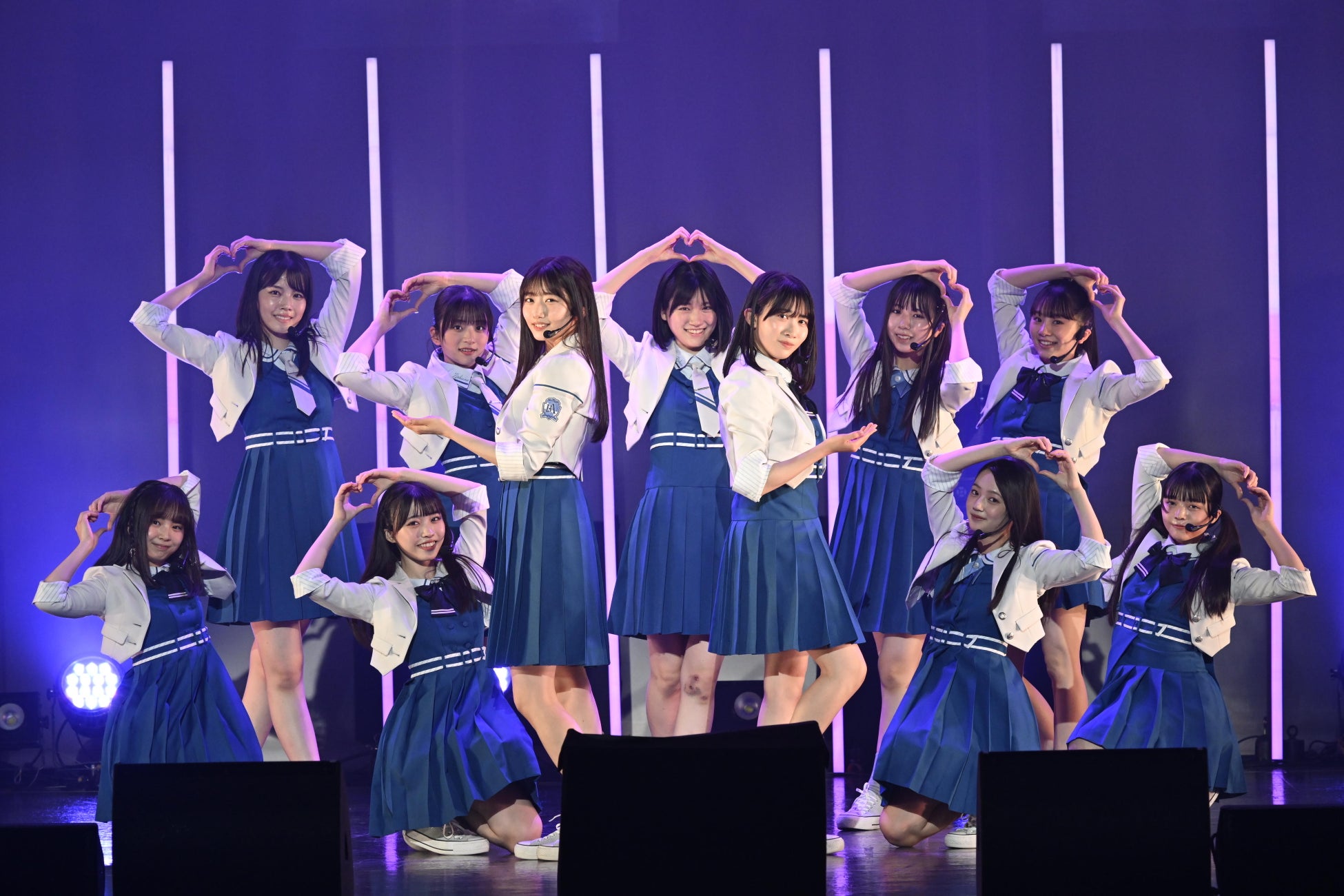 ライブの始まりは2023年6月15日に開催されたメンバー発表会で紹介された順番にメンバーが当時と同じアナウンスでステージに登場。全メンバーが登場したところで、デビュー曲の「青空について考える」が流れると会場からは割れんばかりの歓声と青のペンライトで染まる中、結成1周年記念ライブがスタート。