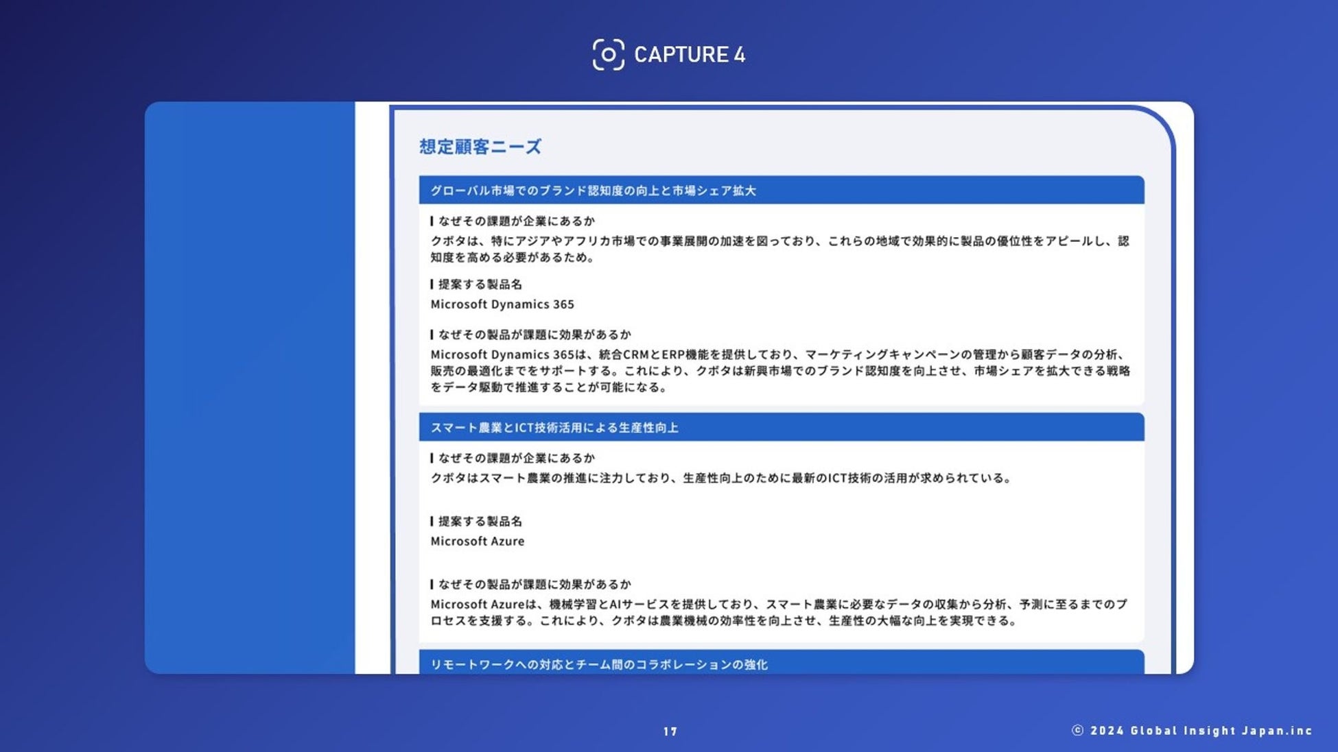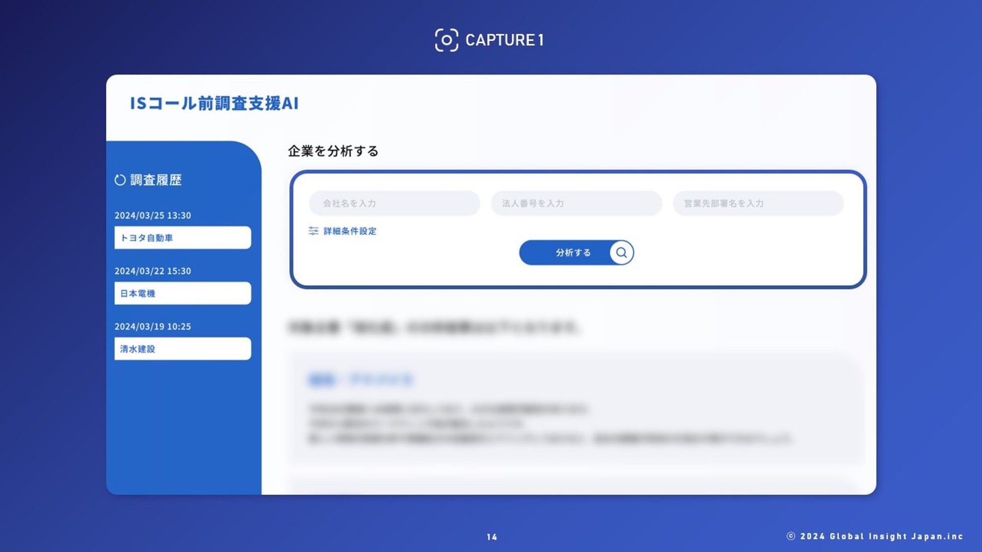 グローバルインサイト合同会社は、インサイドセールス業務の効率化のための、生成AI技術を活用したプロダクトの開発を進めています。このプロダクトは、インサイドセールスにおけるコールの事前準備を支援し、業務効率化と成果向上を図ることを目的としています。