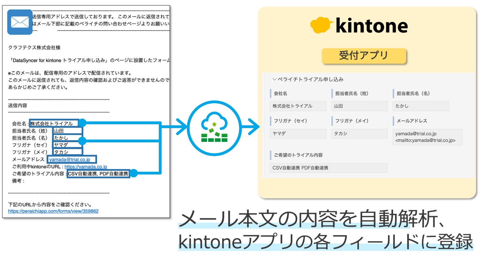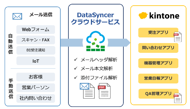 データシンカーは受信したメールをkintoneへ登録できるクラウドサービスで、メール本文、題名などのヘッダ情報、添付ファイルをkintoneアプリに登録を行います。さらに、メール本文や添付PDFファイルから指定された文字列を抽出して、kintoneアプリ内のそれぞれのフィールドへ登録可能です。