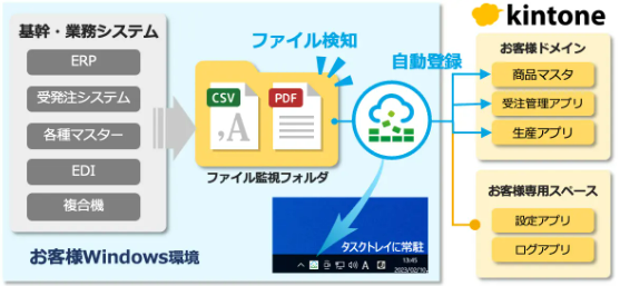 データシンカーはkintone特化型のデータ連携サービスで、メール文書をはじめ、オンプレミスの基幹システムや複合機などから出力されるCSVおよびPDFファイルをkintoneに自動連携(ゼロタッチ連携)するサービスです。