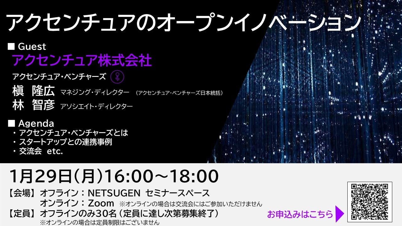 群馬県庁30階に新拠点を構え、新たにNETSUGEN会員となったアクセンチュア株式会社からスタートアップエコシステムと大企業との連携を行う「アクセンチュア・ベンチャーズ」のチームをお迎えして、取組や事例等のご紹介をいただくイベントを開催します。