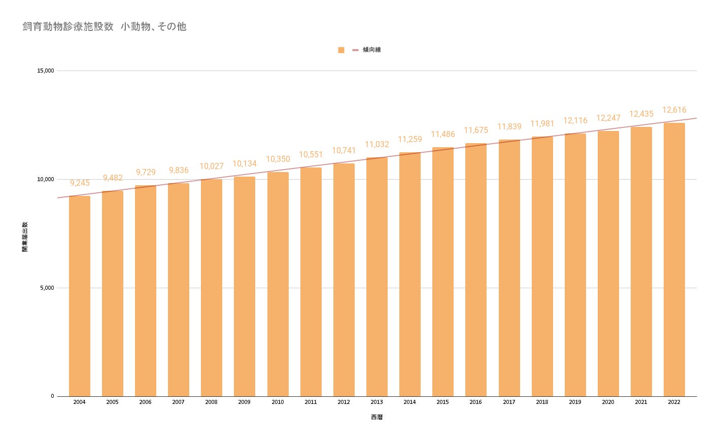 農林水産省が出している飼育動物診療施設の開設届出状況によると、2022年には12,616件となっています。過去10年間で毎年平均188件(前年比平均101.6%)で推移しています。こちらの数値は往診などの施設がない場合も含んでいます。