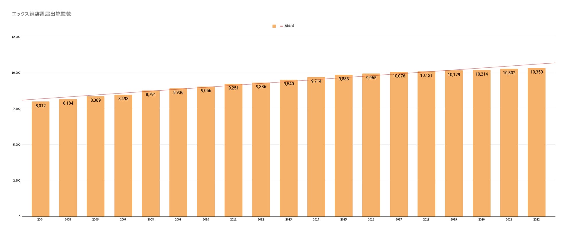 往診ではなく、施設を構えて開業している件数を判断するには、X線設置数の増加数から見るといいでしょう。2022年には、10,350件となっています。つまり、開業届とX線設置数では2,266件の開きがあることが言えます。