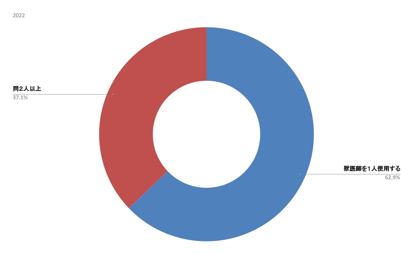 動物病院業界は専門性の高い病院かある程度規模の大きい動物病院になっていく傾向にあります。実際、2022年には獣医師2人以上37.1%(4,684件)となっています。これは2012年と比較すると、3%(1,023件)増加しています。