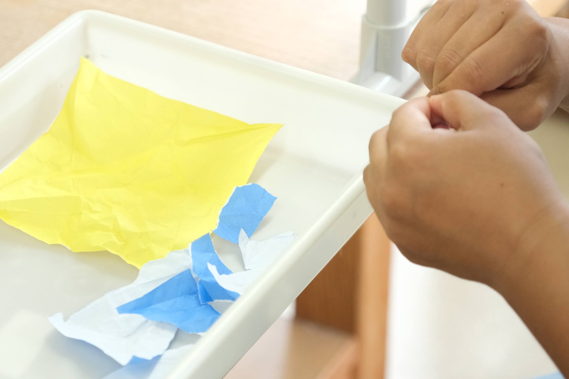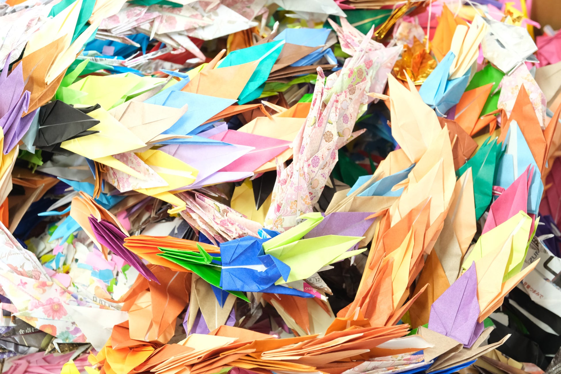 「おりづるペーパー」は、折り鶴に込められた平和への願いや祈りを、福祉施設のおりづる作業所(広島県)でていねいに漉き込んで生まれた紙です。折り鶴を障がいのある方々が一つずつほどき、パルプに混ぜ込んで一枚一枚ていねいに手漉きしています。白地にカラフルな折り鶴のカケラが散りばめらた