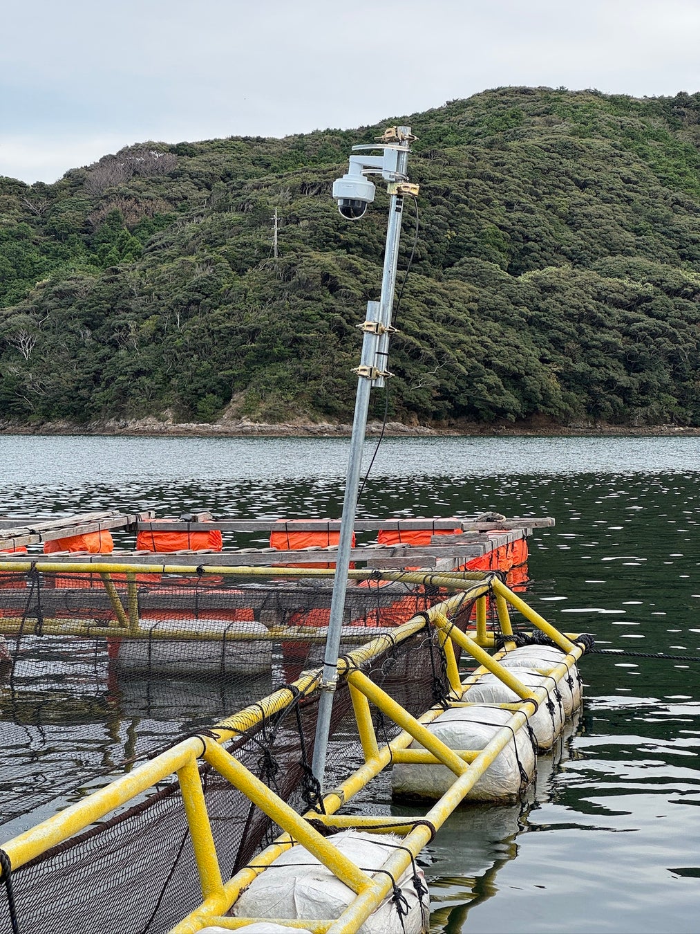養殖生簀周辺に高さ 2m の監視カメラを設置することでカメラ 1 台あたり生簀 4 台の撮影を実現しました。撮影した動画を LAplust が開発した画像認識 AI「LA-Eye」で解析することで、魚のへい死や生簀周辺の異常の検知に成功しました。