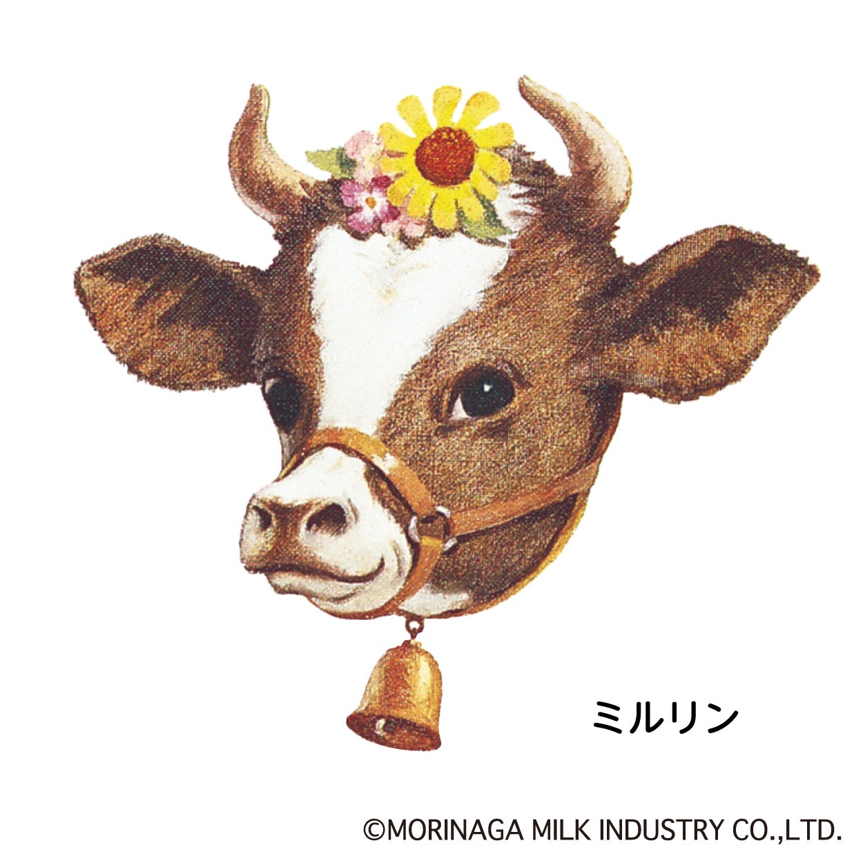 1956 年に、当時の「森永ミルク 加糖れん乳」と「森永βドライミルク」(育児用の調製粉乳)の 2 つの商品に初めて採用されたキャラクターです。当時はデザイナーがいなかった時代。このキャラクターは画家の方に描いていただき、その後さまざまな森永乳業の商品パッケージのシンボルとして活躍しています。誕生から 56 年目を迎えた 2012 年、お客さまからの公募により“ミルリン”という名前が決定しました。ミルクをたくさん出してくれた牛さんで、首のベルがリンリンと鳴っているイメージからきた、かわいらしい名前です。このミルリン付きのパッケージもレトロ感があり、SNSで多数取り上げられています。