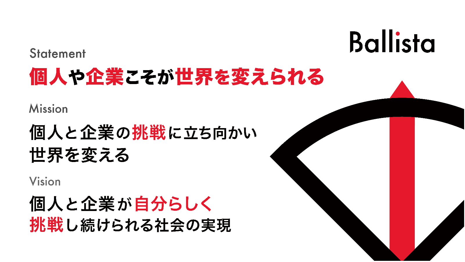 弊社の新たなミッションである“個人と企業の挑戦に共に立ち向かい世界を変える“は、”個人”や“企業“の挑戦に対してBallistaも一人称で共に取り組み、世界を変えるという宣言です。