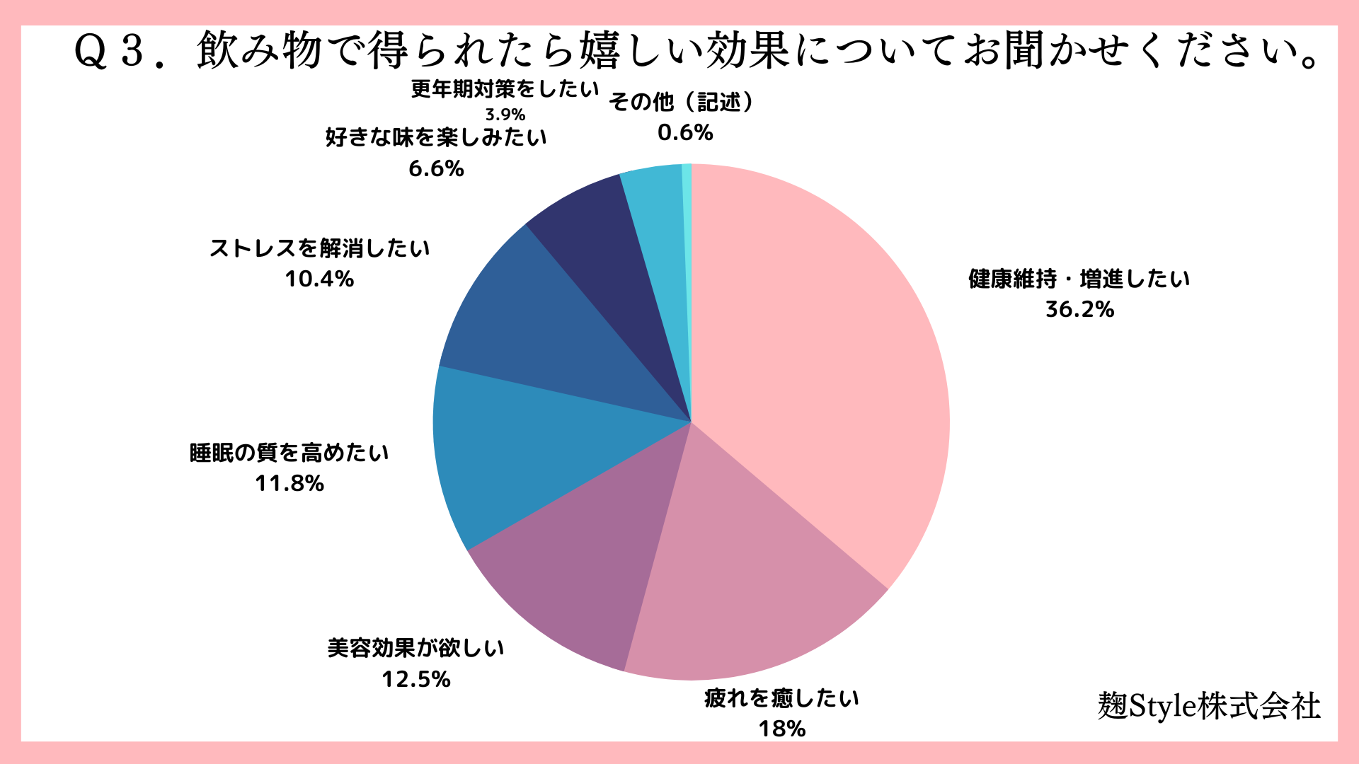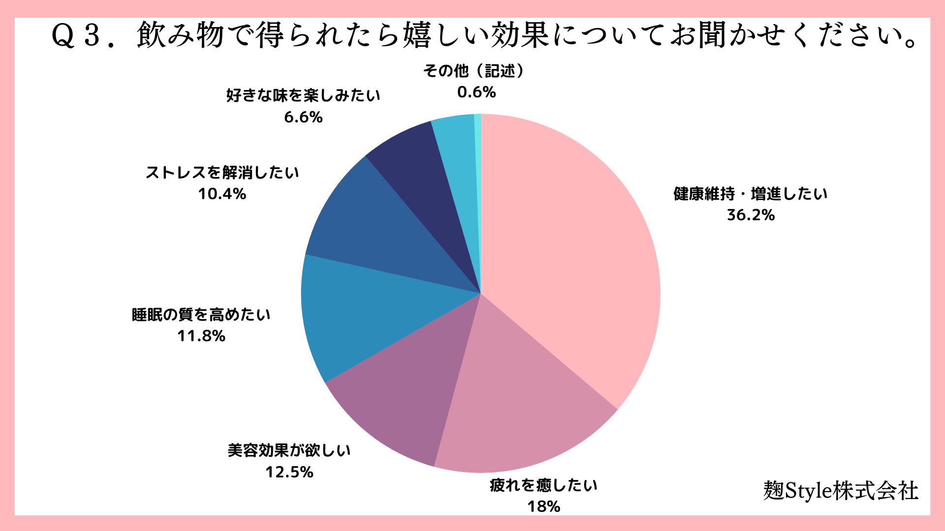 「飲み物で得られたら嬉しい効果についてお聞かせください」という問いに対して「健康維持・増進したい」36.2%、「疲れを癒したい」18%と続き、2項目で全体の半数以上を占めました。