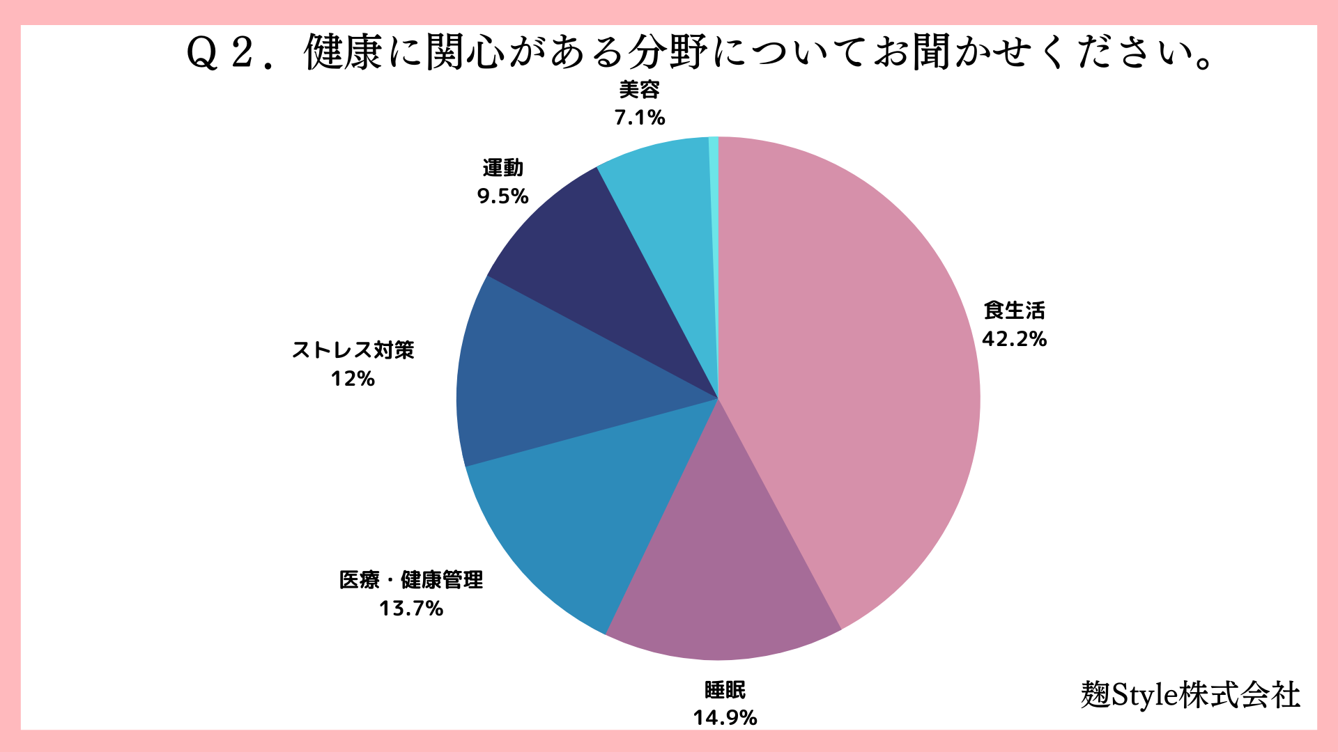 「健康に関心がある分野についてお聞かせください」という問いに対して、『食生活』と回答した人が42.2%、続いて『睡眠』14.9%、『医療・健康管理』が13.7%と続く結果となりました。