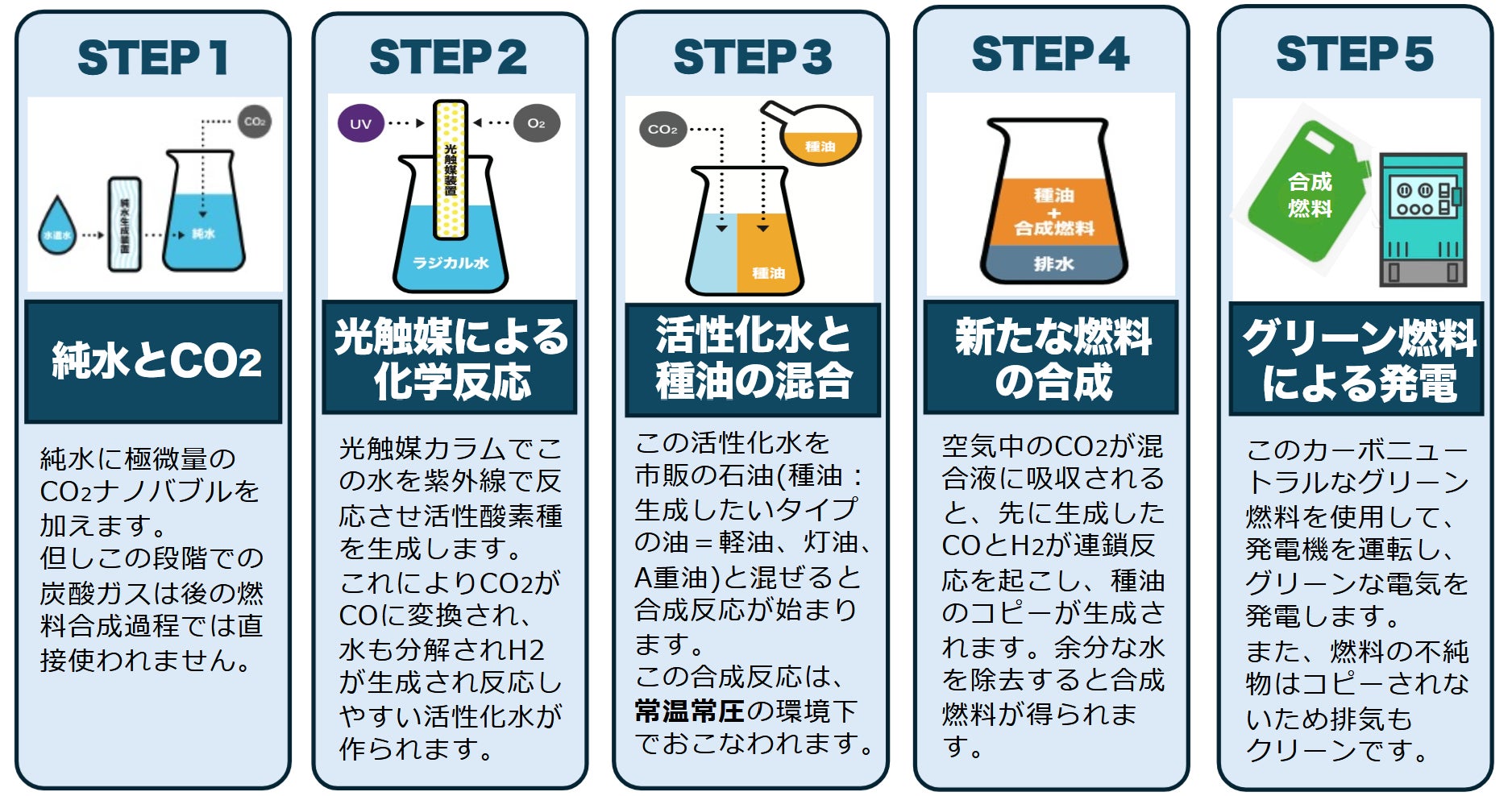 グリーン燃料は⽔と⼤気中のCO2を原料とし、常温常圧の環境下で⽣成される低コストな燃料であり、燃料利⽤時に燃焼し排出されるCO2は、グリーン燃料⽣成時に⼤気中から取り組まれたCO2であるため、カーボンニュートラルな燃料・電気と言われております。