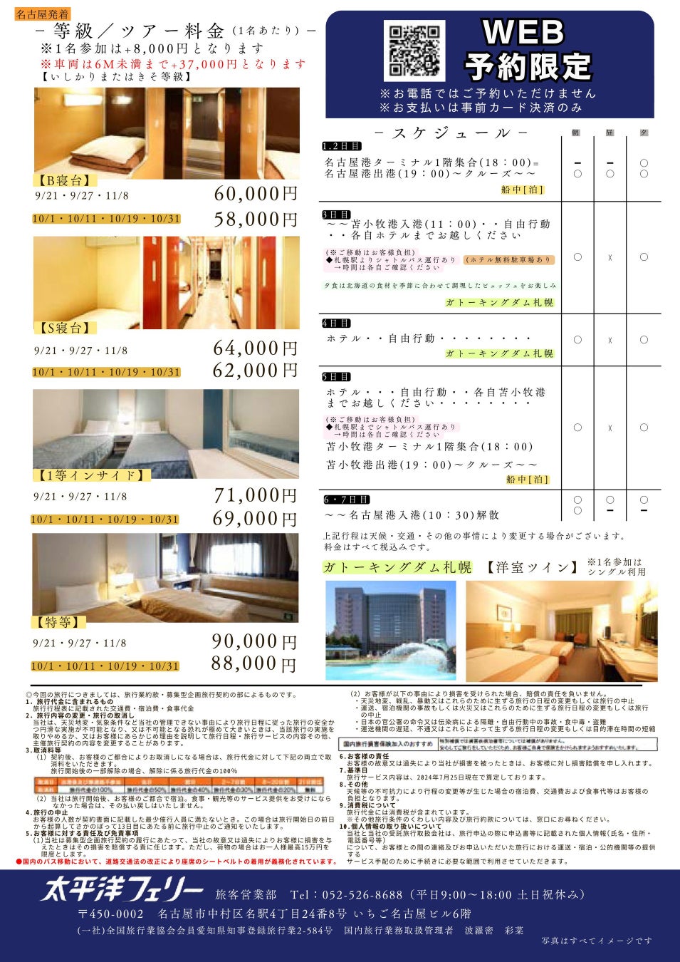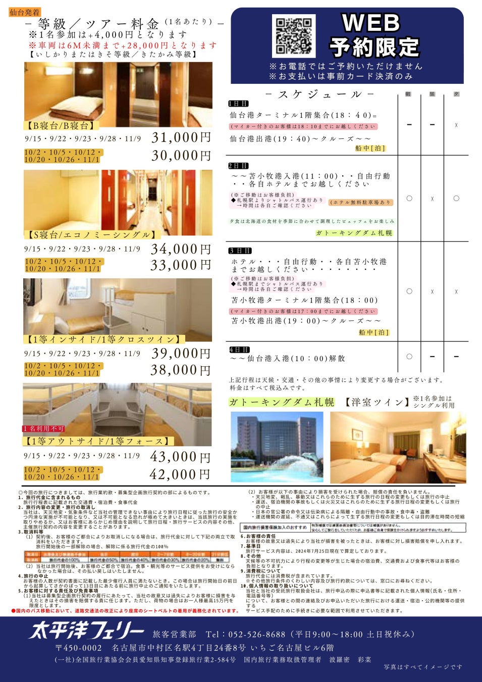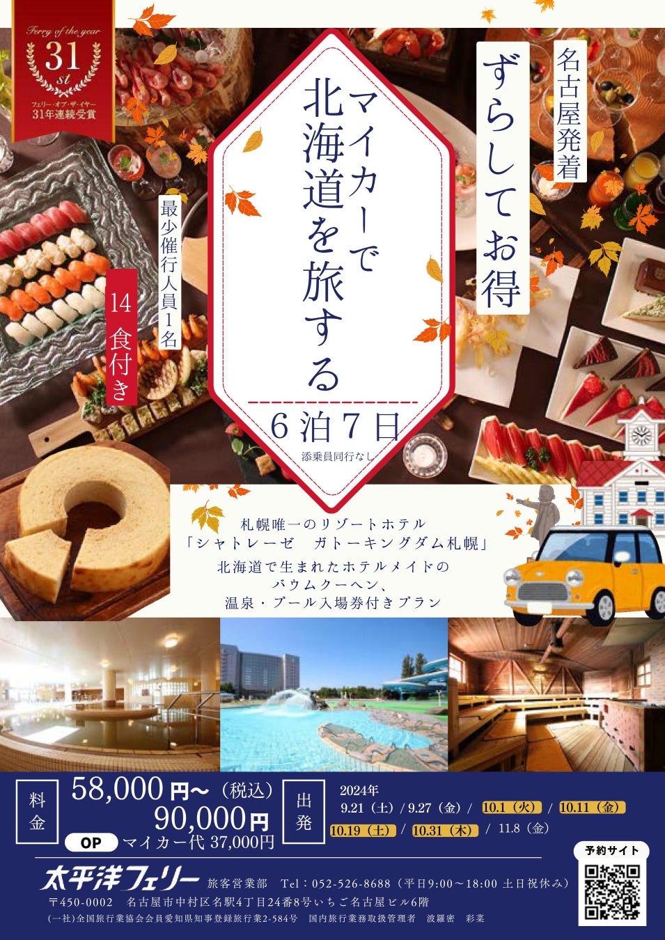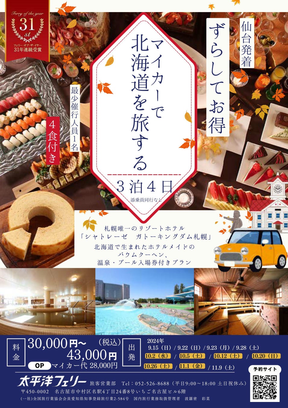 名古屋・仙台・苫小牧間でフェリーを運航する太平洋フェリー株式会社(本社:名古屋市中村区)は2024年9月~11月の出発日限定で、往復フェリーを利用した北海道ツアー商品を販売いたします。