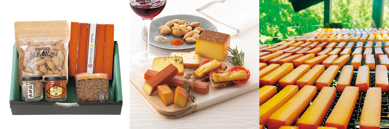 岐阜県恵那市岩村町の大自然の中、間伐材のヤマザクラ・ナラなどでオリジナルブレンドチップを作り、選び抜いた素材を香りと味わいにこだわって燻製しています。約8時間じっくりと燻煙したスモークチーズをはじめ、燻製おつまみ・調味料などを詰め合わせました。