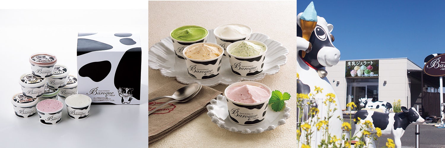 渥美半島のベテラン酪農家がたどりついたのは、バロック音楽(1/f ゆらぎ)を聴かせてのびのびと牛を育てること。そんな牧場から毎朝届く新鮮なバロック生乳と、地元の果物や野菜などを掛け合わせたフレーバーにこだわった、贅沢ジェラートセットをお届けします。