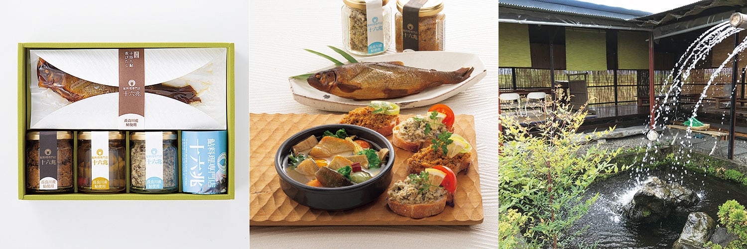 鮎を知り尽くす専門店〈十六兆〉では、世界農業遺産清流長良川の鮎を、水の都大垣の地下水で育てています。3日間ゆっくりと炊きあげた「子持ち鮎の煮びたし」や、鮎の美味しさをオイルで包み、パスタや酒肴にアレンジできるように仕上げた贈りものです。