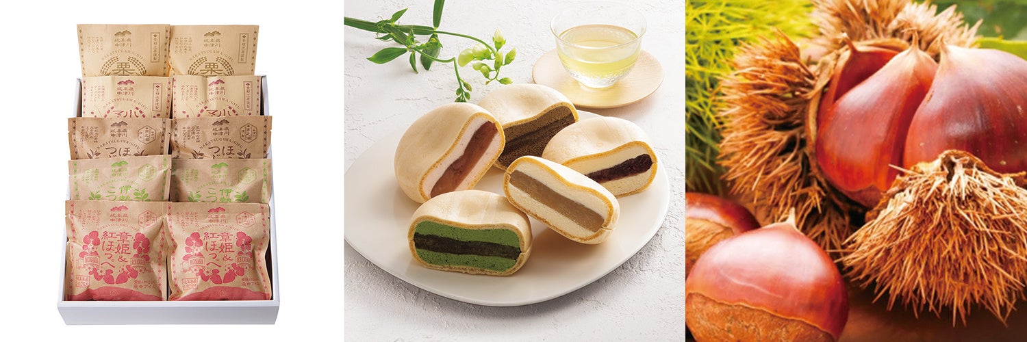 パリッパリの最中の皮にたっぷりサンドした、中津川の栗を贅沢に使った和栗餡・和栗甘露煮とバニラアイスのバランスが美味しさのポイント。他に、伊勢茶・豊田のほうじ茶・岐阜の紅ほっぺなど、東海の特産を使用した5つの風味の最中アイスを詰め合わせました。