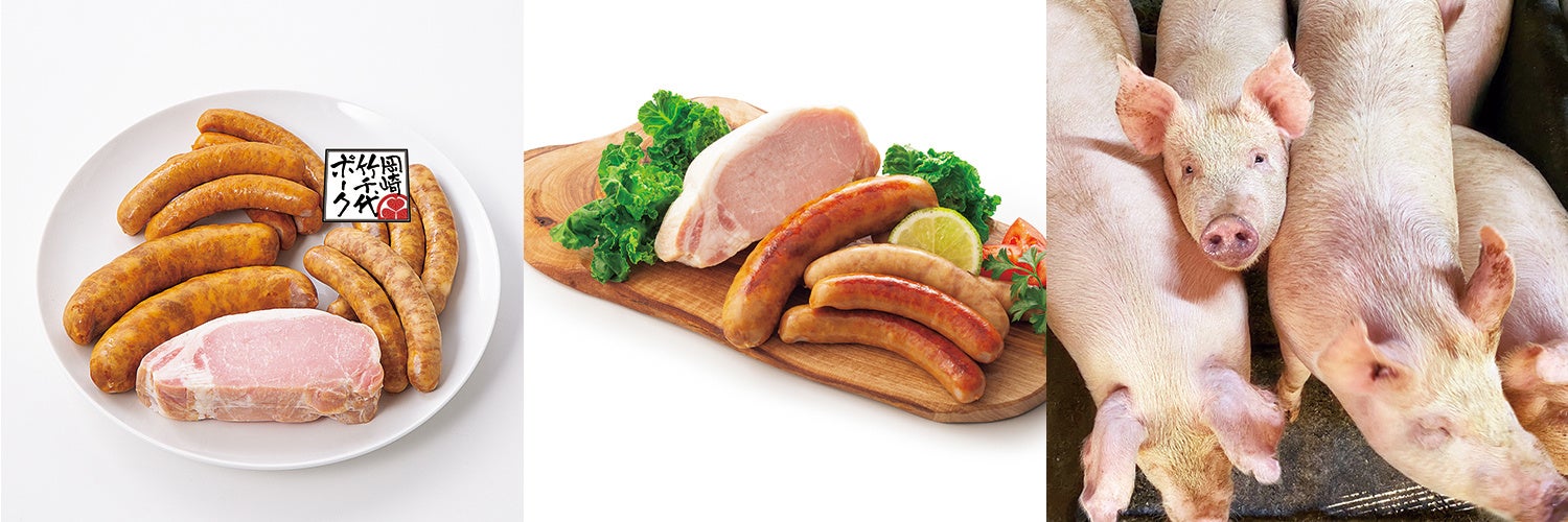 ブランド豚肉”岡崎竹千代ポーク”は、岡崎生まれの岡崎育ちで、あっさりとした肉質と甘みのある脂、独特の風味が特徴。安心・安全にもこだわった、自慢のロースハムをはじめソーセージやフランクフルトといった、岡崎竹千代ポーク100%使用の贅沢なラインアップです。