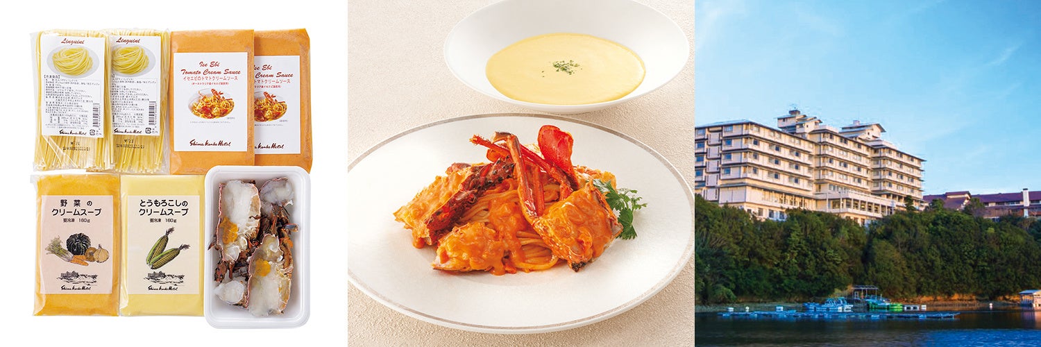 2016年G7伊勢志摩サミットの会場になった〈志摩観光ホテル〉から、伊勢海老の繊細な味と香りを楽しめる贅沢なパスタセットをお届け。伊勢海老の旨味を凝縮したトマトクリームソース、もちもちのリングイネ、伊勢海老、野菜本来のおいしさを引き出したクリームスープのセットです。