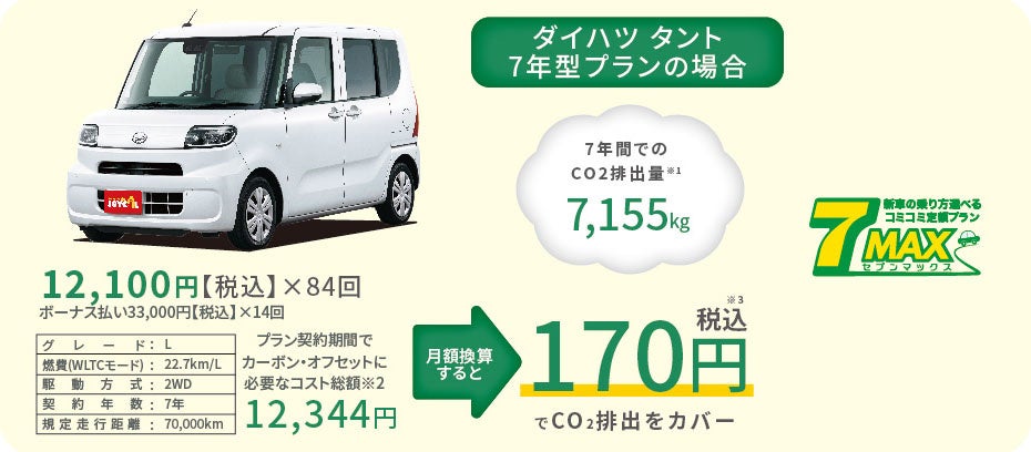 例)ダイハツ タント L 2WD 月額(税込)12,100円(ボーナス加算額:33,000円)契約年数7年