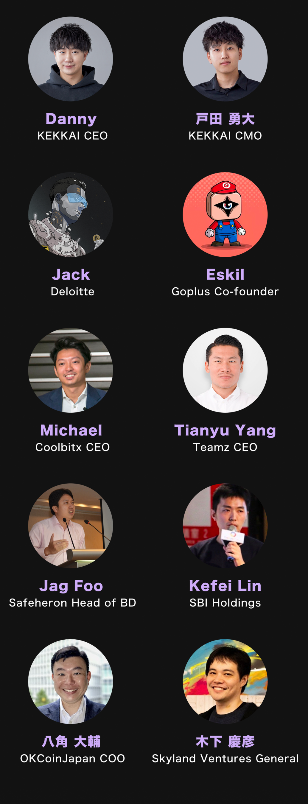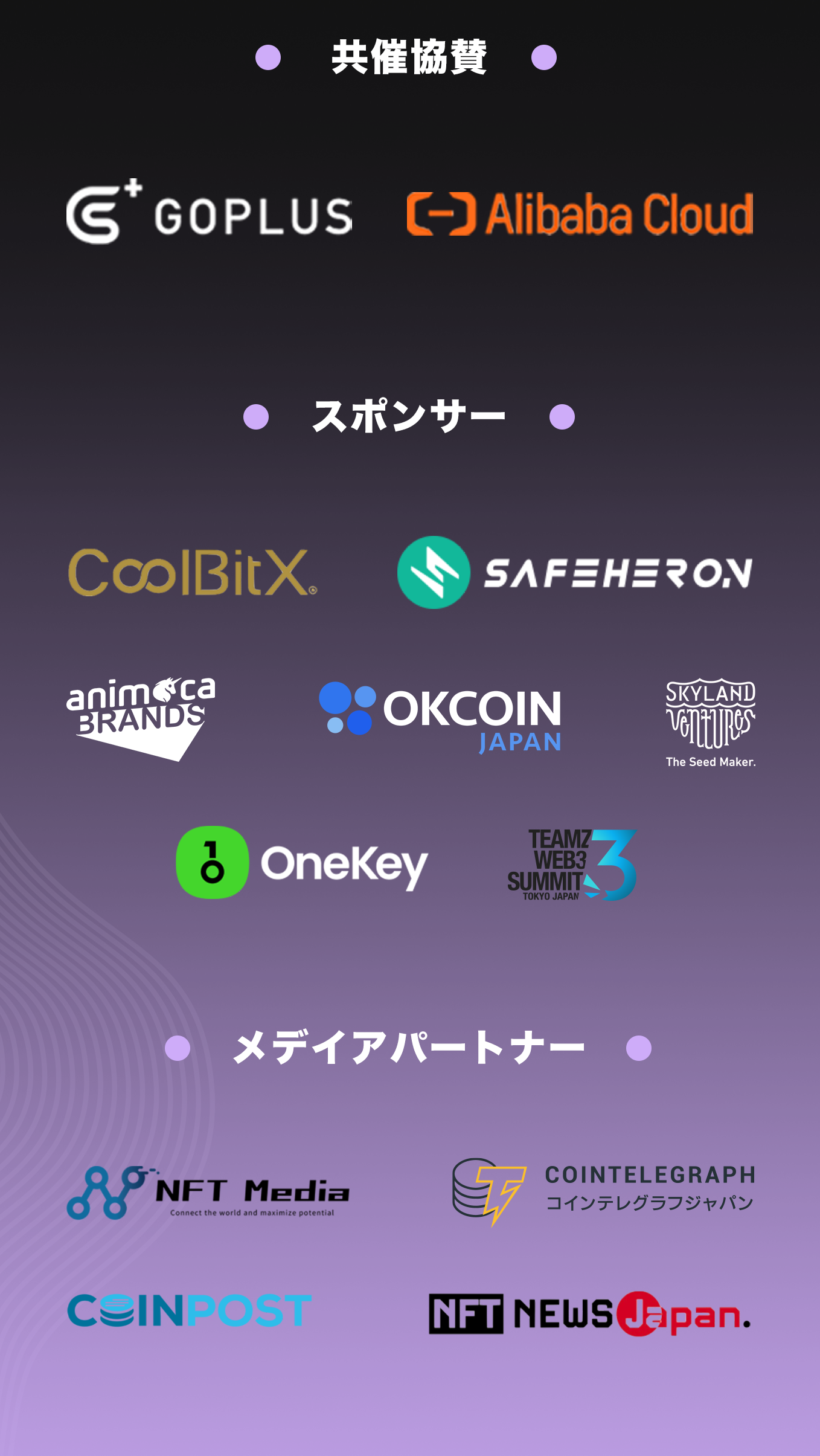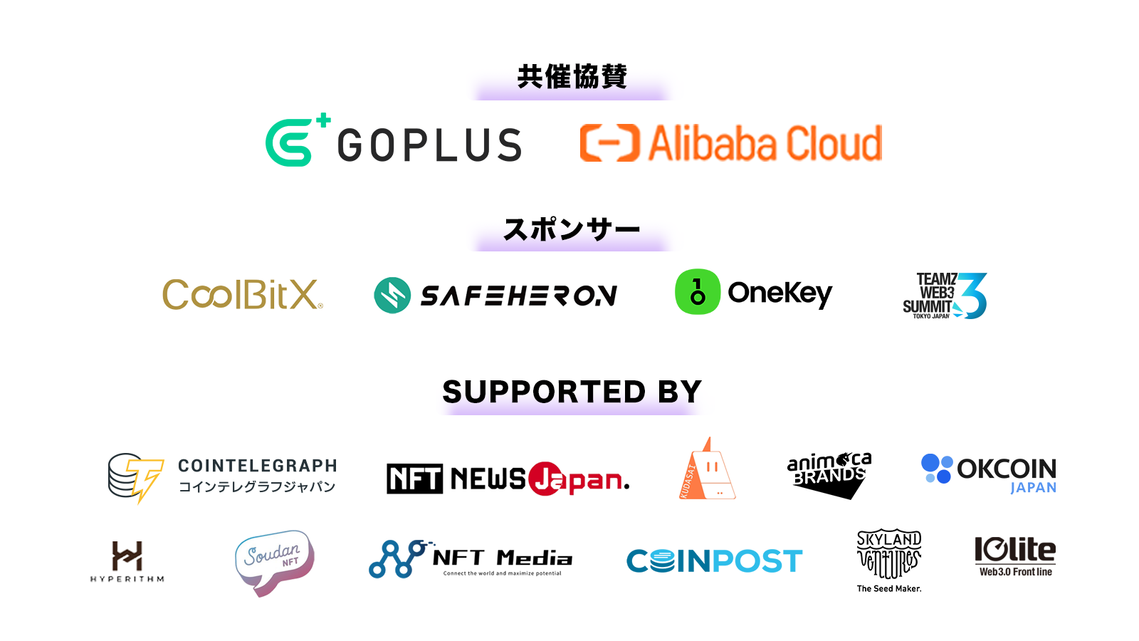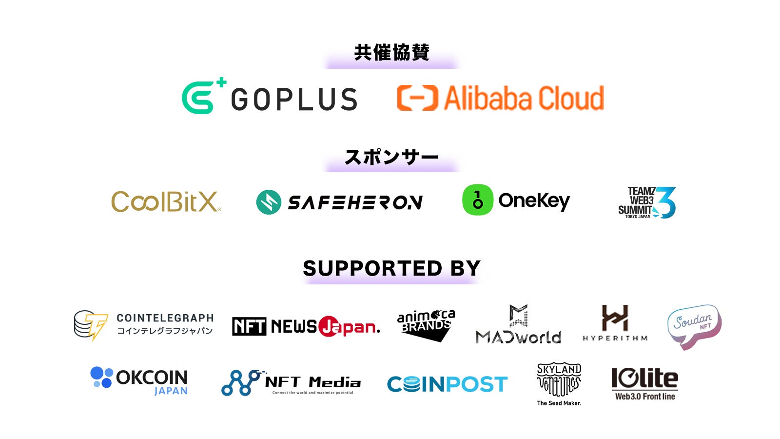 KEKKAI ZONE開催に至り、共催としてご支援下さったWeb3セキュリティインフラを提供されている「GoPlus」様、クラウドサービスを提供されている「Alibaba Cloud」様、並びにスポンサーとしてハードウェアウォレット開発会社「OneKey」様・「CoolBitX」様・日本正規暗号資産取引所「OKCoin Japan」様・MPCウォレット開発「Safeheron」様・Web3総合ブランド「Animoca Brands」様・ベンチャーキャピタル「Skyland Ventures」様、国内最大級クリプトコミュニティ「SoudanNFT」様、クリプト系イベント会社「TEAMZ」様、各社様に心より感謝申し上げます。