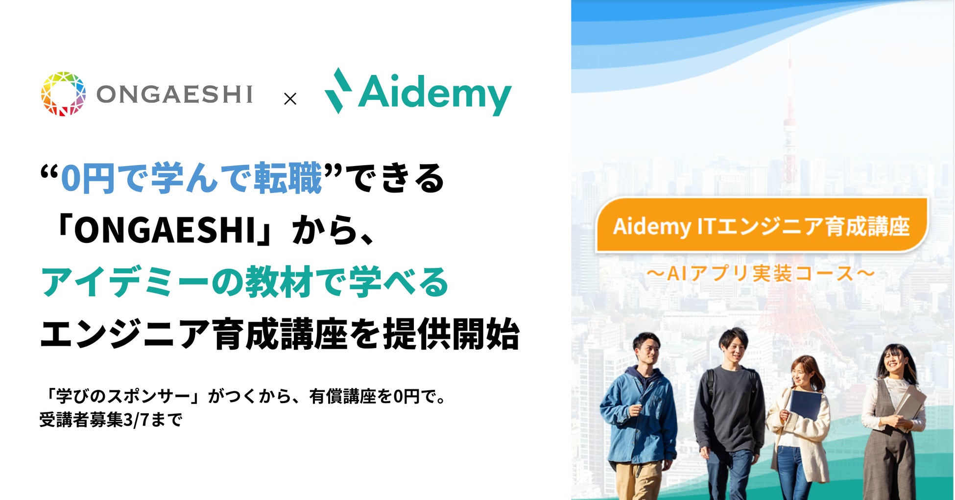 AI/DX分野のリスキリングを支援する株式会社アイデミー(以下、アイデミー)と、教育格差の是正を目指すONGAESHIプロジェクトチーム(以下、ONGAESHI)は、“0円で学んで転職”のプラットフォーム「ONGAESHI(オンガエシ)」で、アイデミーとONGAESHIのオリジナルコラボ講座「Aidemy ITエンジニア育成講座 〜AIアプリ実装コース〜」(以下、本講座)の提供を開始したことをお知らせします。