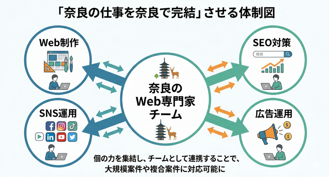 当社は、奈良を拠点にWeb制作・Webマーケティング支援を行っており、地域の事業者同士がつながることで、奈良の中で仕事が循環し、さらに全国から案件が集まる状態を目指しています。