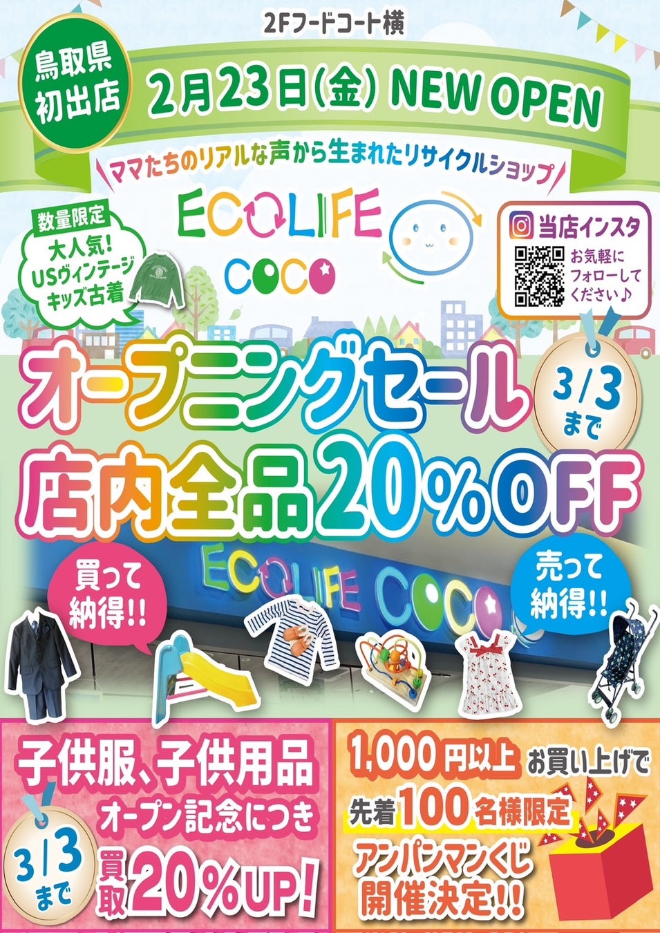 子供服リサイクルショップECOLIFE COCO(エコライフココ)鳥取県初出店となる「イオンモール日吉津店」を2024年2月23日(金)にオープンすることが決定いたしました。
