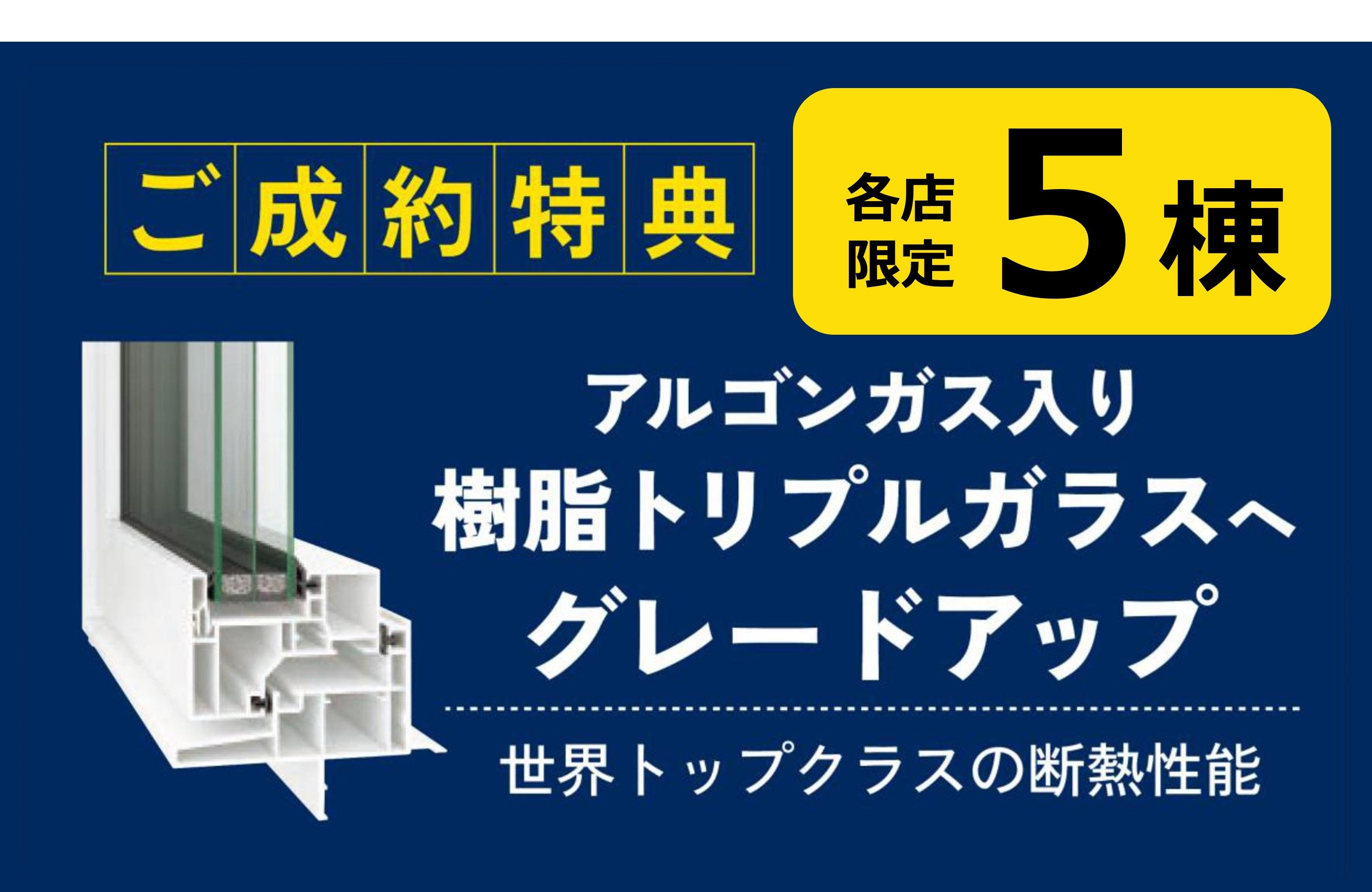 ご成約特典として、GWキャンペーン期間中、各店5棟に限り、世界トップクラスの断熱性能を有する「アルゴンガス入り樹脂トリプルガラス」へグレードアップいたします。