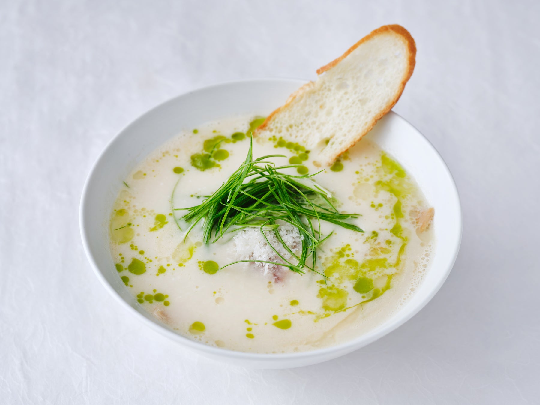 西村流とんこつスープには、和風出汁、肉と香味野菜からとるブイヨンにあわせ、数種類の チーズをブレンドしています。 海苔を乗せるのではなく、青のりのオイルをアクセントに、鶏の燻製チャーシューと、豚肩 ロースのチャーシューをトッピング。最後に九条ネギを添えた、クリーミーとんこつラー麺。 西村貴仁シェフの世界観をぜひお楽しみください。